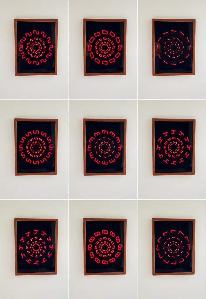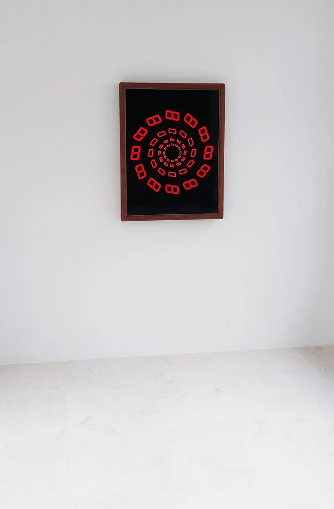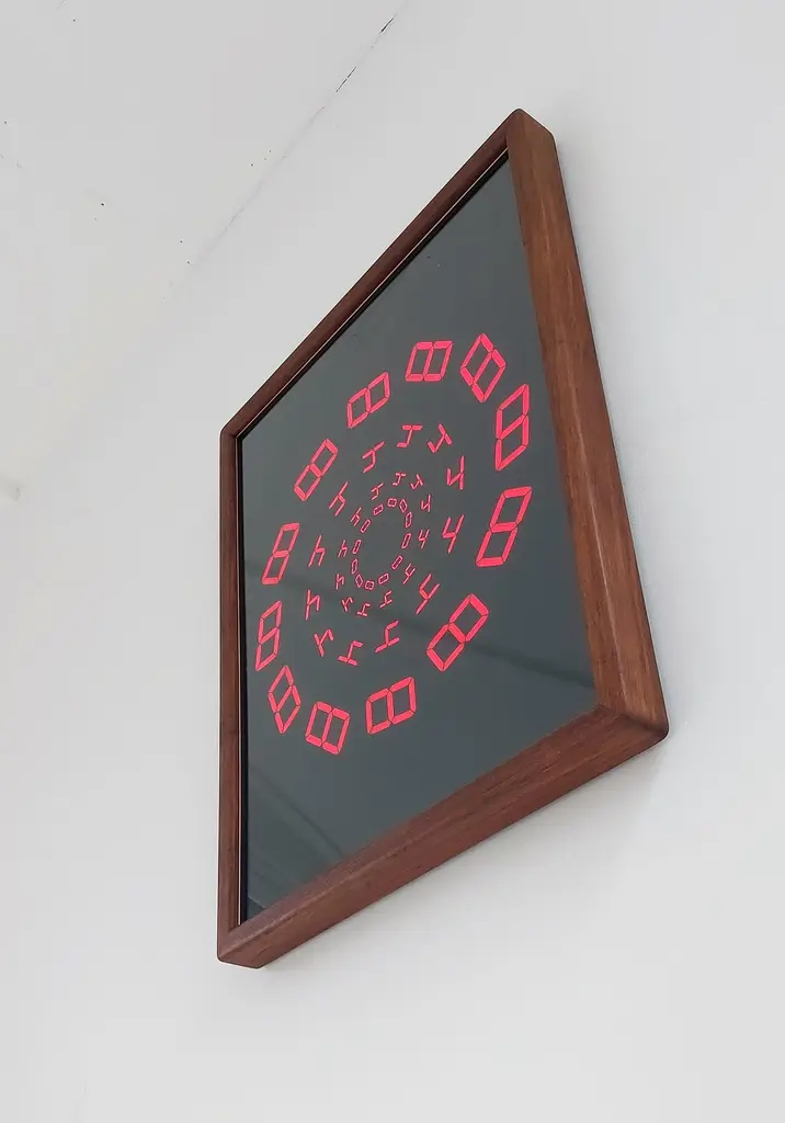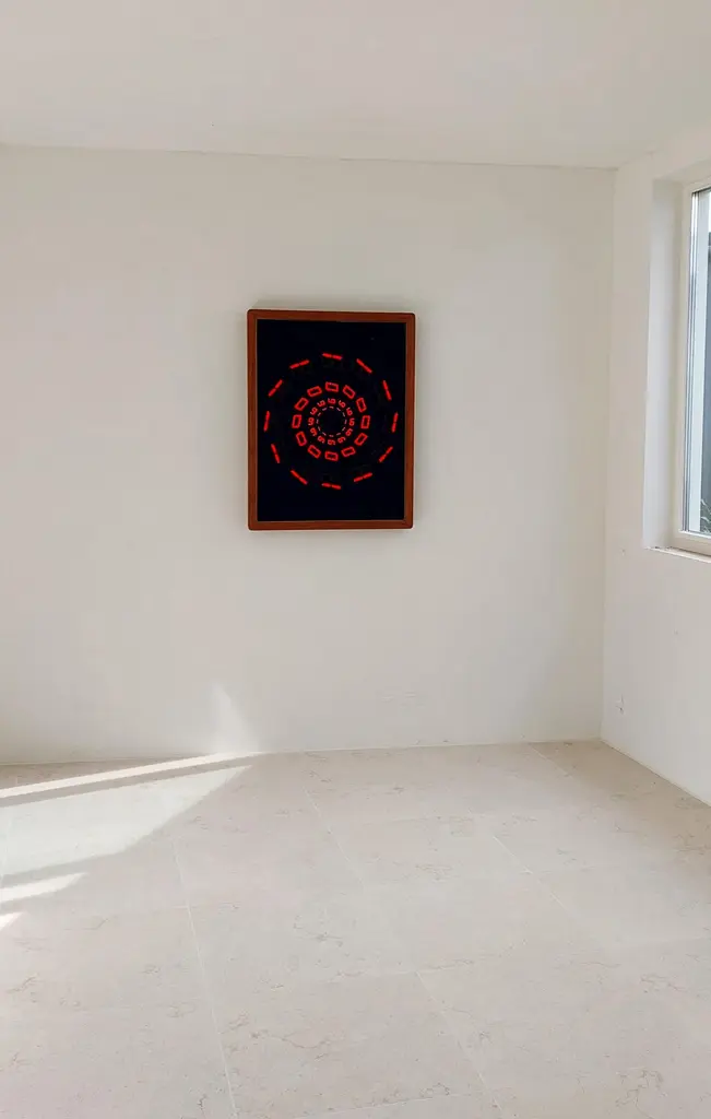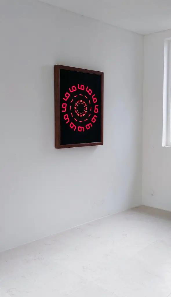 "TIMEWARP" continuously changing wall-mounted artwork.A large, wall-mounted, artwork that also tells the time if you look closely.Every minute: one, two , three or four numbers change as time changes.This creates a new glowing red pattern, a new artwork placed against the black backdrop.There are 1440 minutes in a day.Timewarp displays 1440 different patterns in 24 hours.Some number combinations have a more powerful effect. Some more subtle.When four numbers at the same time change , for example: from 23.59 to 00.00: that has the biggest effect.This creates a very visually interesting and dynamic artwork.The digital numbers are placed in a ring. mimicking the position of numbers on a classic analog clock.“TIMEWARP” pays homage to the first digital alarm-clocks. At the time a revolutionary way of telling time.Red digital LED-numbers projected against a black background. Cased in a hardwood housing.I used, and enhanced that visual language to create something new.The digital clockwork is covered by a mirror-less glass plate.The artwork is cased in a beautiful solid pressed bamboo frame.The bamboo is sanded and oiled, bringing out the caramel color and grain.Inspired by insomnia:In my youth when I could not sleep, ideas keeping me awake, staring at my alarm-clock. The only thing visible in the night where the shining red numbers.Every minute the time would change.I did not see the numbers, but patterns and lines changing shape each minute.This childhood memory inspired my to use and enhance that imagery.Edition of 100Functions: on-off / dimmable / time settingMaterial: caramel pressed bamboo frame.Glass coveraluminum back. Dimensions HxWxD = 104x79x8 cm. HxWxD 50X31,1x3,1 inchweight: 20 kg.Voltage: 100-240 voltWattage: 30 WATT USA plug on request.