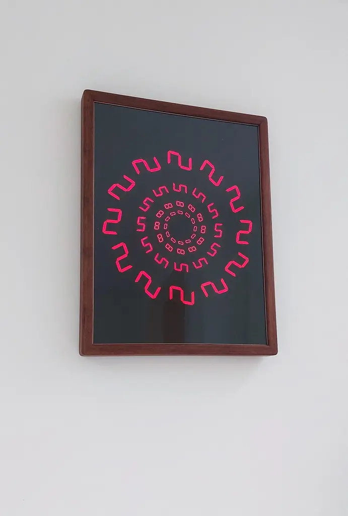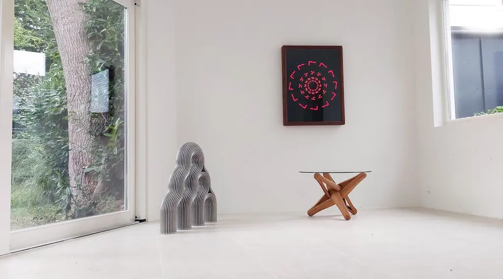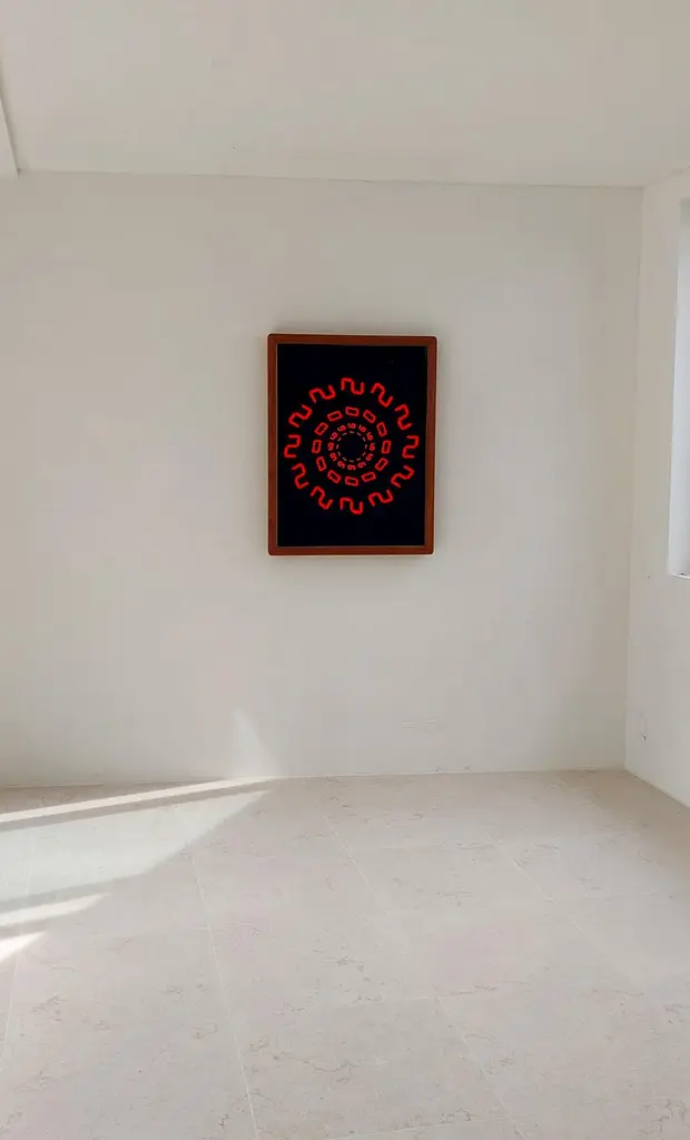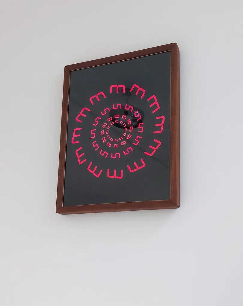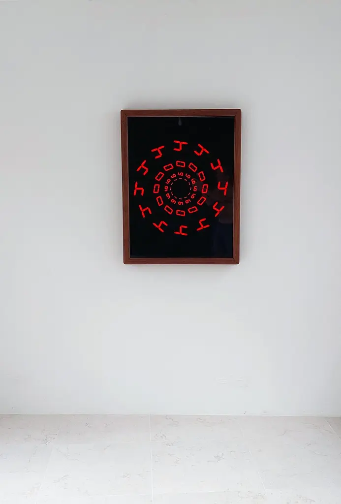 "TIMEWARP" continuously changing wall-mounted artwork.A large, wall-mounted, artwork that also tells the time if you look closely.Every minute: one, two , three or four numbers change as time changes.This creates a new glowing red pattern, a new artwork placed against the black backdrop.There are 1440 minutes in a day.Timewarp displays 1440 different patterns in 24 hours.Some number combinations have a more powerful effect. Some more subtle.When four numbers at the same time change , for example: from 23.59 to 00.00: that has the biggest effect.This creates a very visually interesting and dynamic artwork.The digital numbers are placed in a ring. mimicking the position of numbers on a classic analog clock.“TIMEWARP” pays homage to the first digital alarm-clocks. At the time a revolutionary way of telling time.Red digital LED-numbers projected against a black background. Cased in a hardwood housing.I used, and enhanced that visual language to create something new.The digital clockwork is covered by a mirror-less glass plate.The artwork is cased in a beautiful solid pressed bamboo frame.The bamboo is sanded and oiled, bringing out the caramel color and grain.Inspired by insomnia:In my youth when I could not sleep, ideas keeping me awake, staring at my alarm-clock. The only thing visible in the night where the shining red numbers.Every minute the time would change.I did not see the numbers, but patterns and lines changing shape each minute.This childhood memory inspired my to use and enhance that imagery.Edition of 100Functions: on-off / dimmable / time settingMaterial: caramel pressed bamboo frame.Glass coveraluminum back. Dimensions HxWxD = 104x79x8 cm. HxWxD 50X31,1x3,1 inchweight: 20 kg.Voltage: 100-240 voltWattage: 30 WATT USA plug on request.