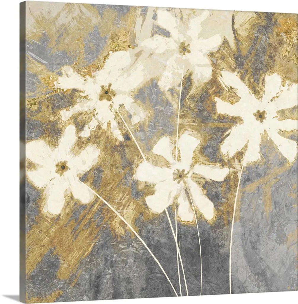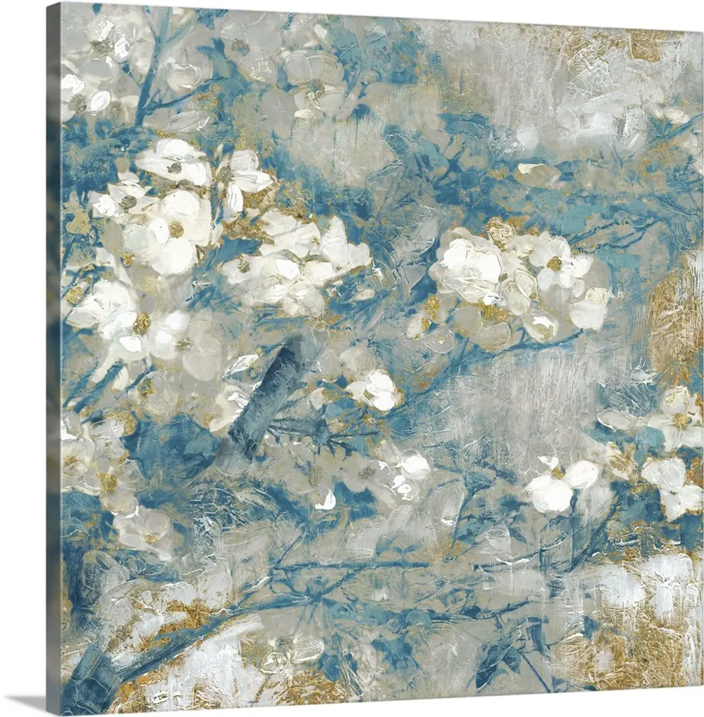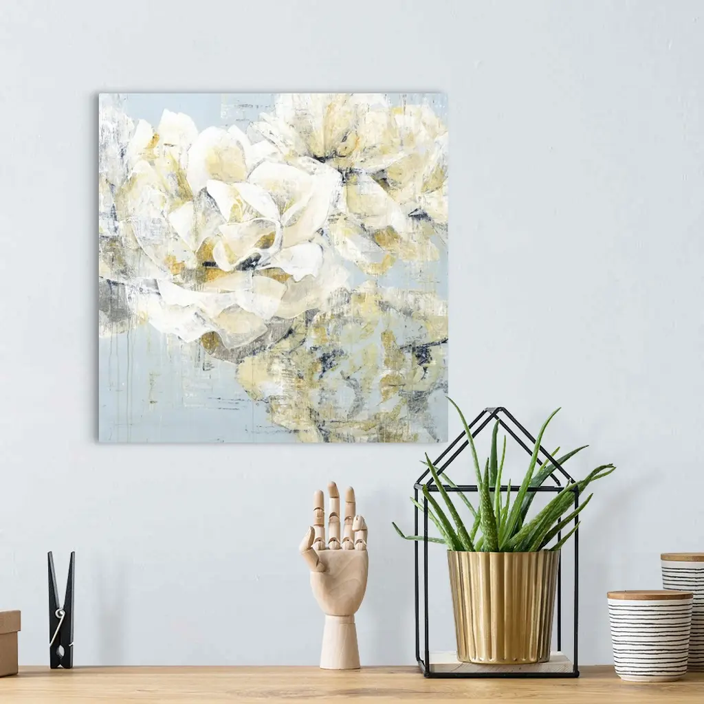 Square painting of white roses with gold and silver highlights with an antique feel on a pale blue background.
