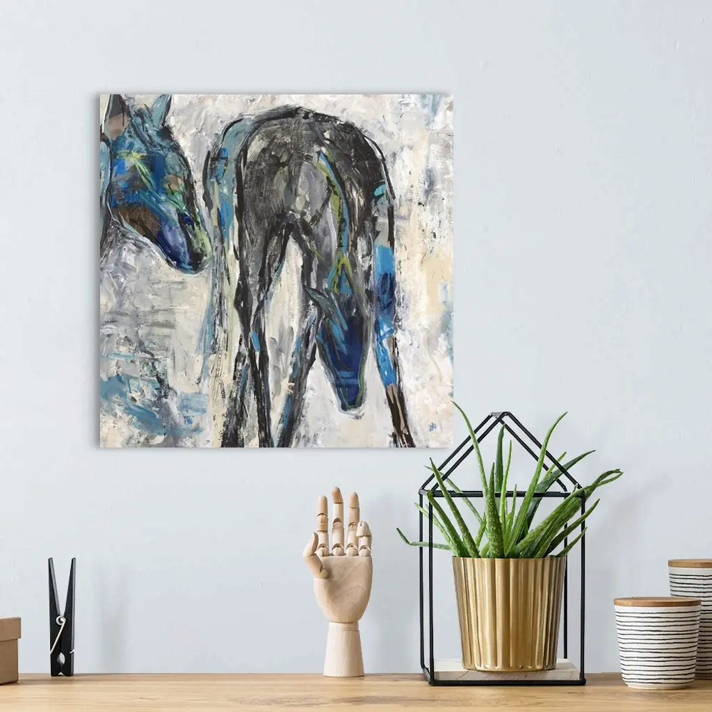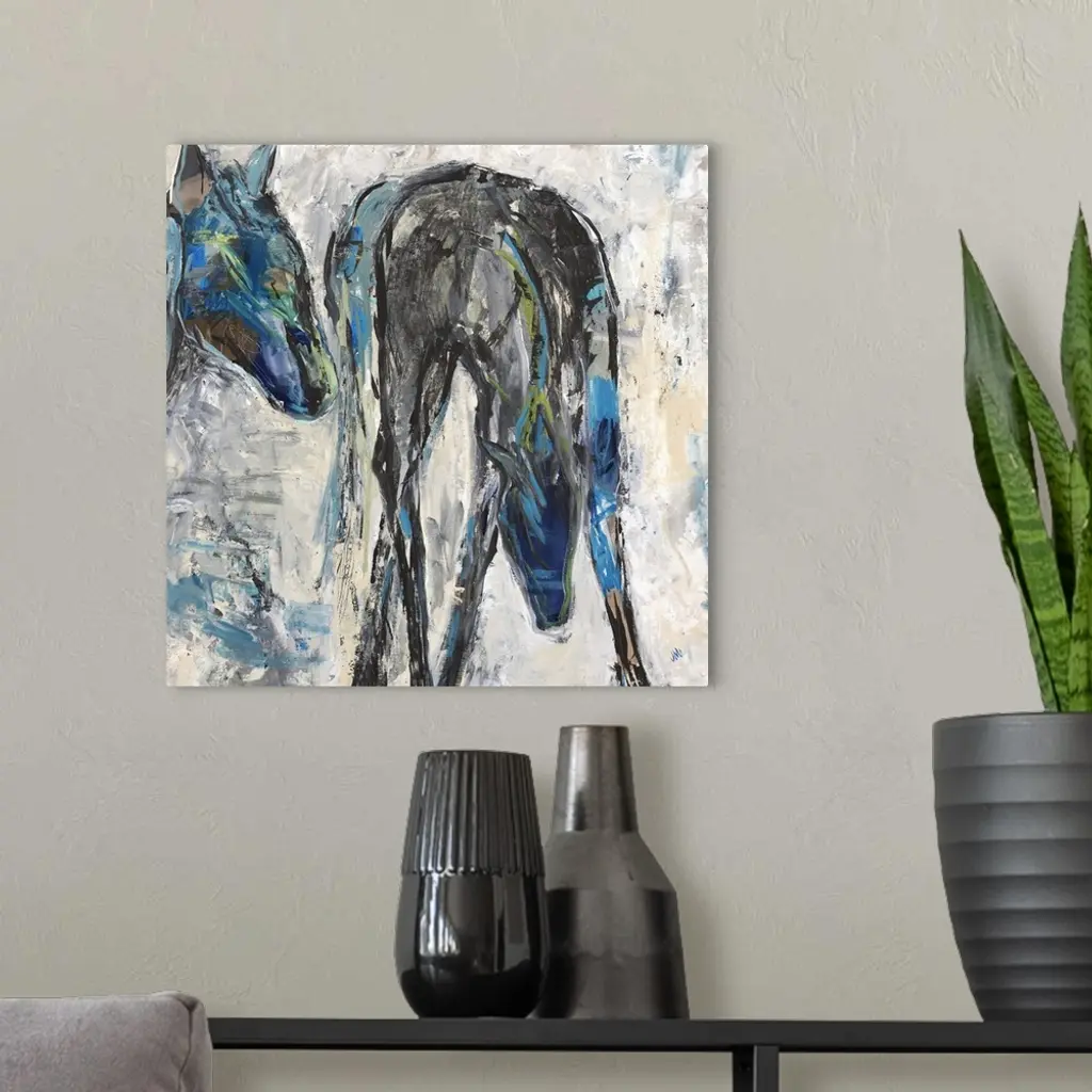 Contemporary painting of two horses in shades of blue and black.