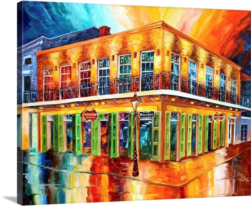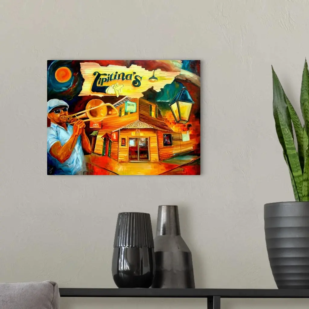 Contemporary artwork of a New Orleans restaurant with a man painted to the left playing the trombone.