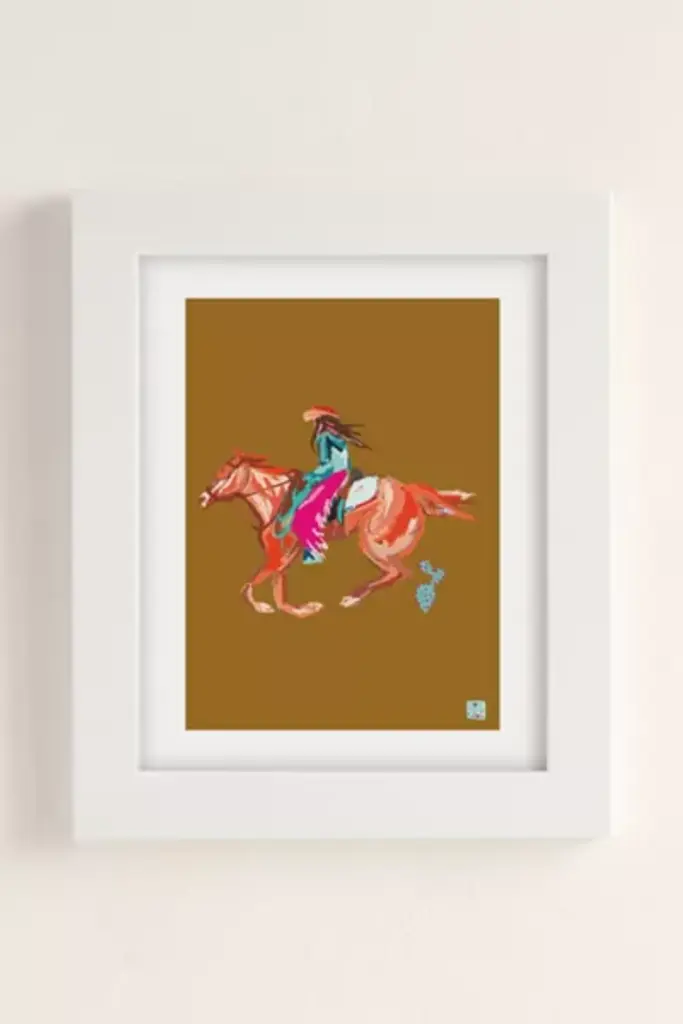 Art print by Tirzahlaneart featuring a colorful cowgirl atop a vibrant horse. Printed on archival paper made from cotton pressed in Italian mills, this high-quality art print is available in sizes and frames just right for your space. First select your frame (or go frameless), then select your size. **About the Frames** \- The exact width of each frame may vary slightly \- All frames are manufactured in the US \- Matte frames are durable poly \- Wood frames are recycled wood \- All are fitted with protective plexiglass \- Finished with wood moldings, archival backer and protective bumpers **Size** \- Available in multiple sizes \- Use the Size Guides to find the size that fits your space **Content + Care** \- Wipe clean \- Made in the USA