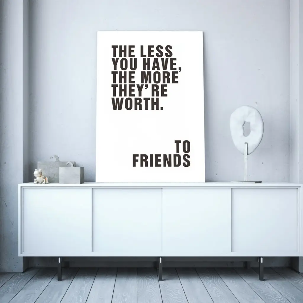 A simple message about friendship. While you could certainly place this interesting typographic piece in your own home, it would also make an excellent gift to someone close to you as a testament to your friendship. This simple piece would work well in any room, with any color scheme and will easily complement any existing artwork. Features:- Original design- Gallery quality cotton canvas and solid wood frame- Made in USA- Gallery wrapped canvas art- Sawtooth hangers installed- Wipe with damp cloth