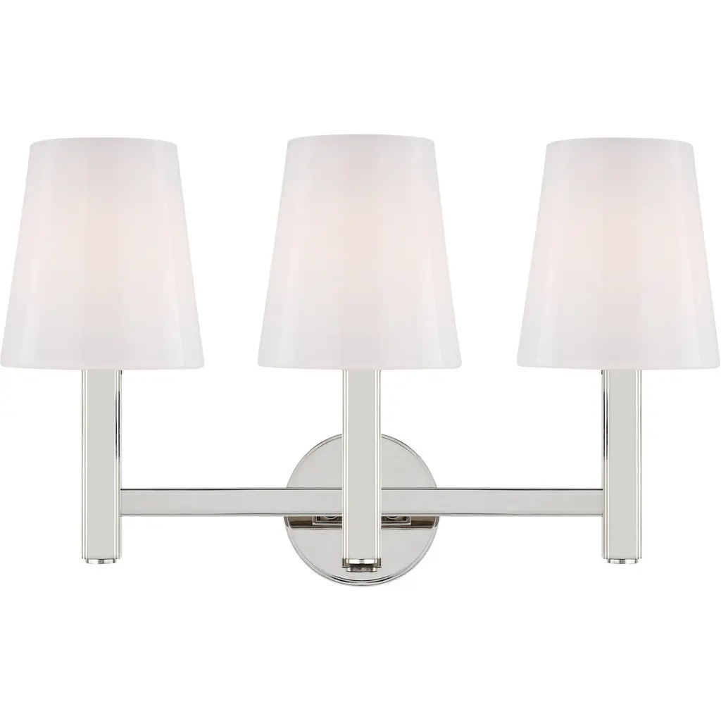 The Logan three light vanity fixture features tapered Milk White glass shades atop slim arms set along a horizontal beam and into a round backplate. Available with two or three lights finished in Aged Iron or Polished Nickel. Suitable for damp locations. The Logan family of products from TOB Thomas O'Brien for Generation Lighting mirrors Thomas' masterful design aesthetic of bridging traditional and modern styles. Elegant curves soften structured frames and clean lines, lending aesthetic balance and versatility to Logan lighting fixtures.