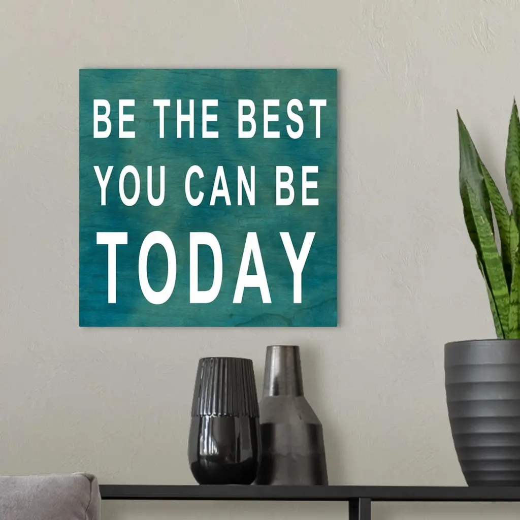 Square, large inspirational artwork of big text that reads "Be the best you can be today", on a background of cool tones with a wood texture.