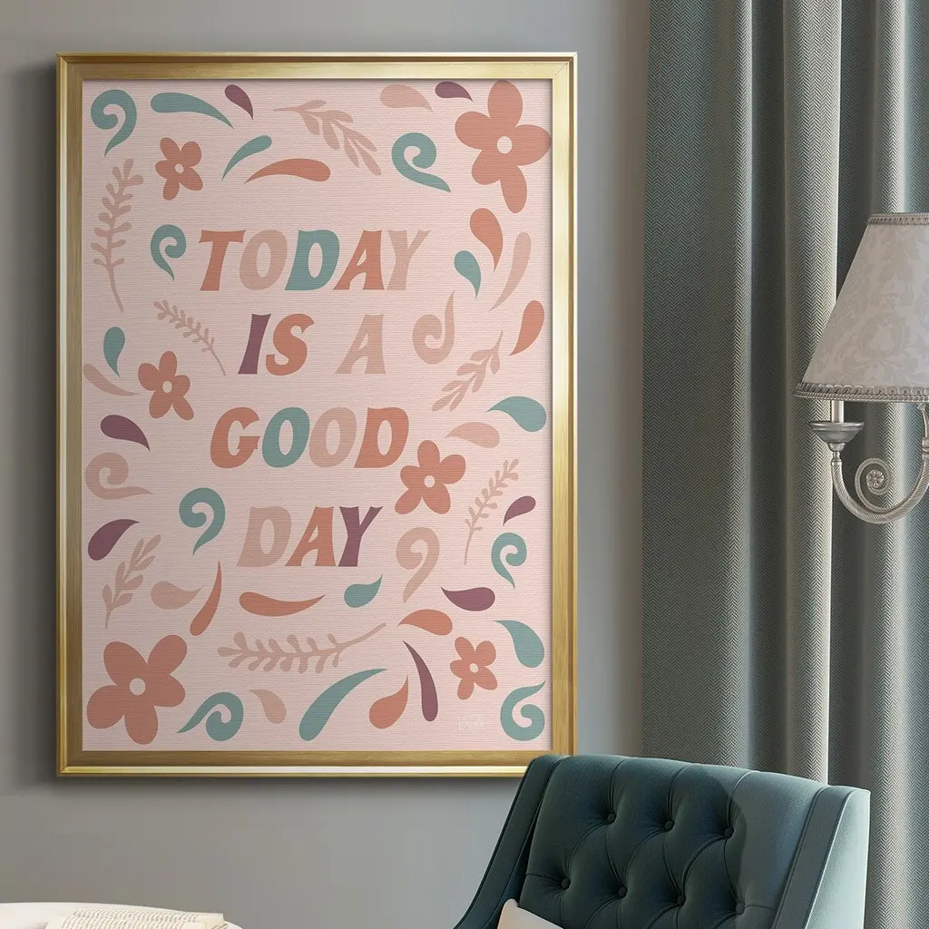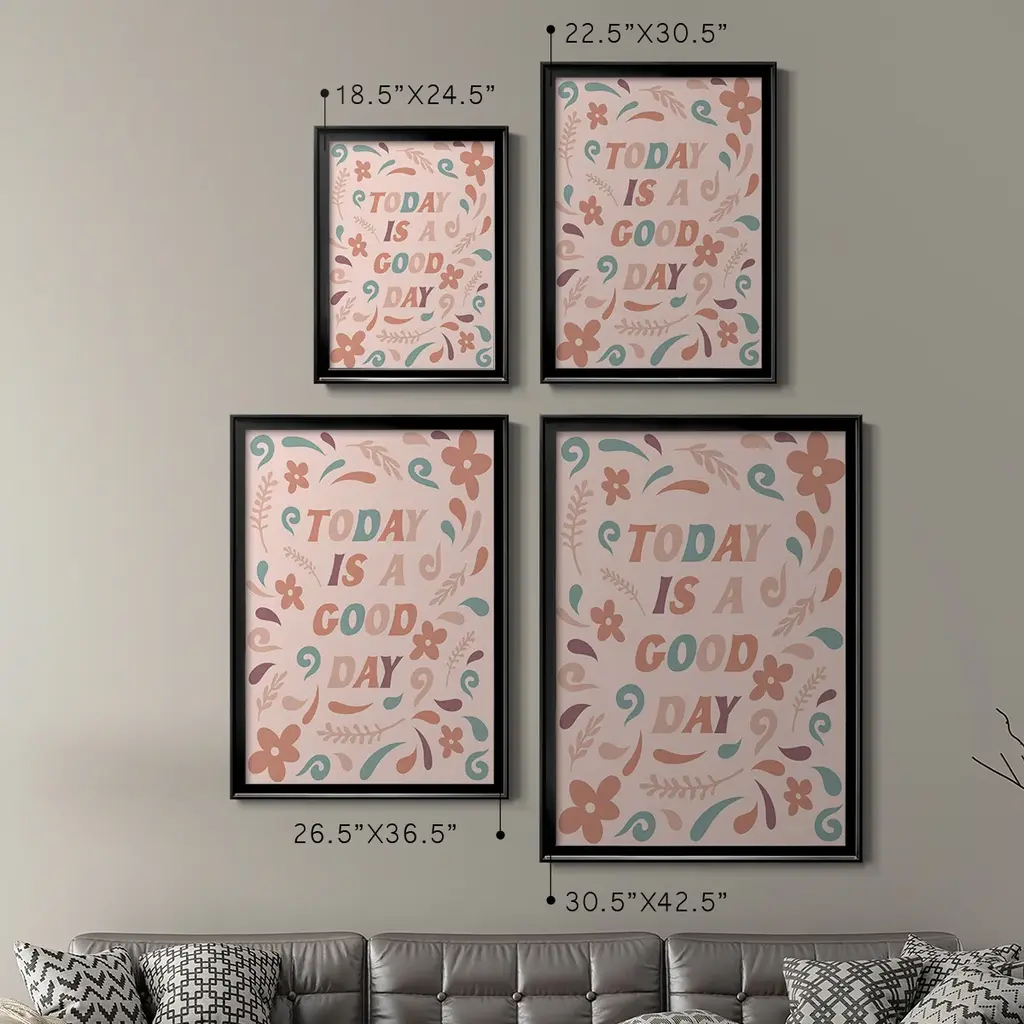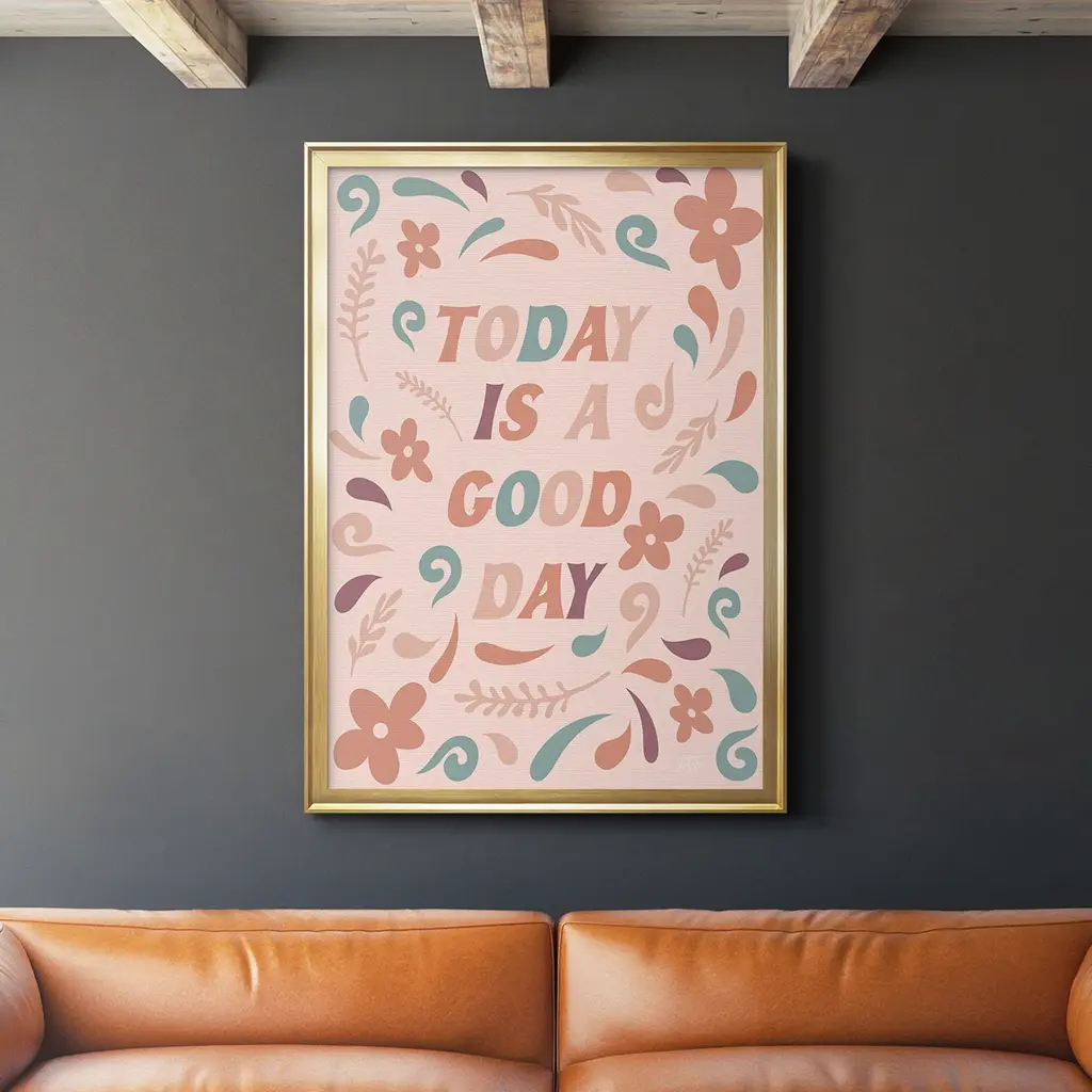 Today is a Good Day Premium Framed Print - Ready to Hang A Premium Framed Print created to last. Framed in distressed wood and available in an array of sizes and colors Featuring a beveled a solid wood stretcher bar, each piece comes ready to hand 4 SIZES AVAILABLE 30.5''X42.5'' - Overall Size 26.5'X36.5'' - Overall Size 22.5''x30.5'' - Overall Size 18.5''x24.5'' - Overall Size Each piece is made to order. Each piece comes with hanging hardware. Made in the USA Ready to Hang