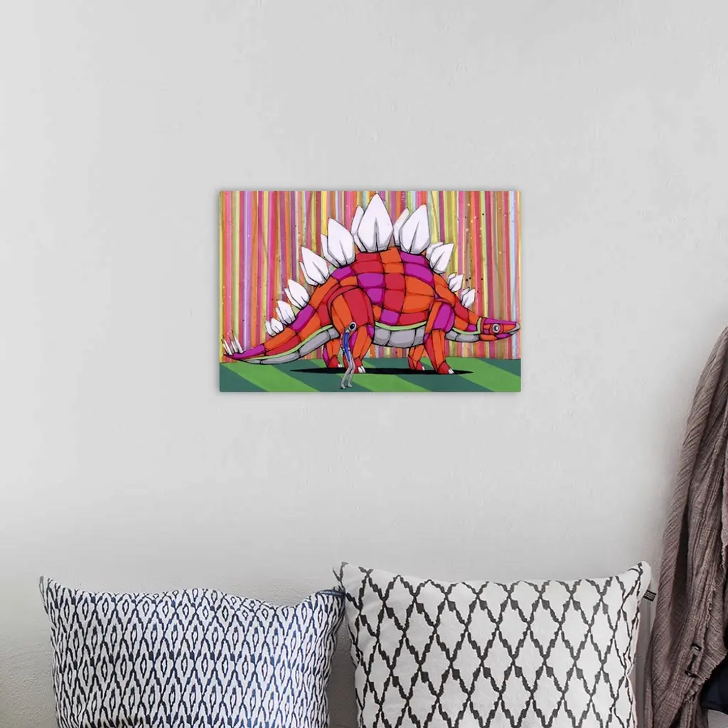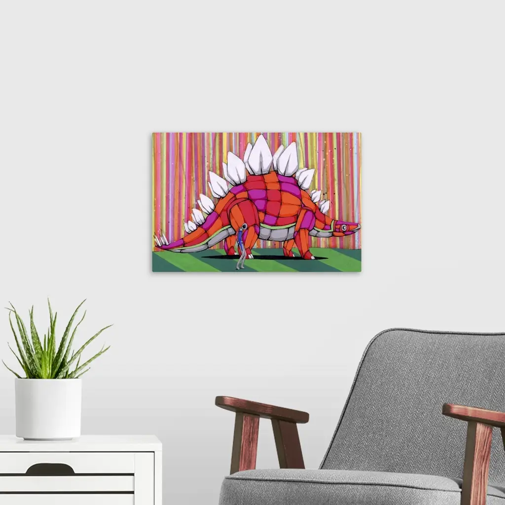 Pop art painting of a man walking with a stegosaurus.