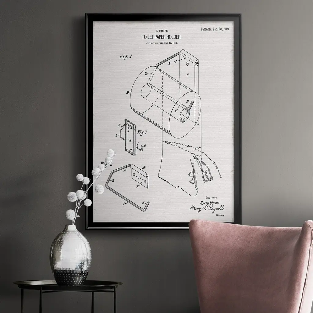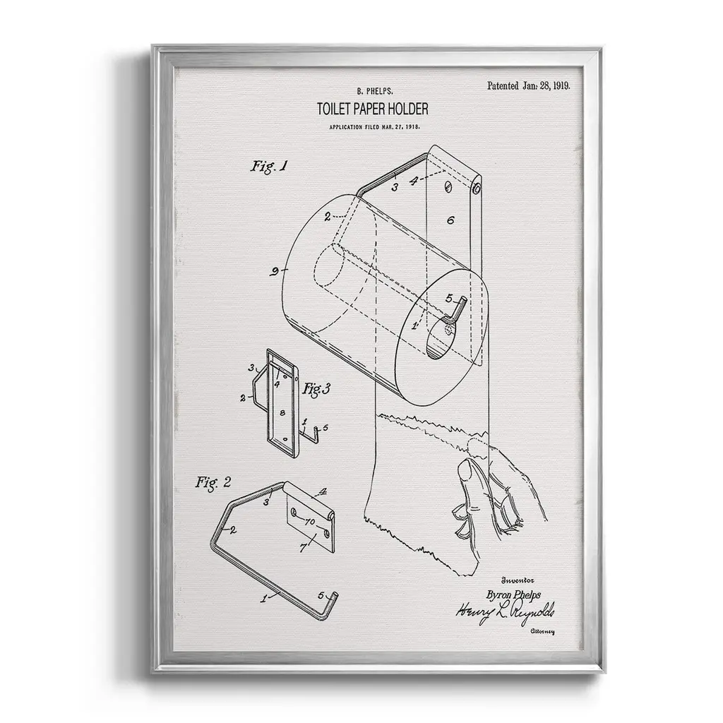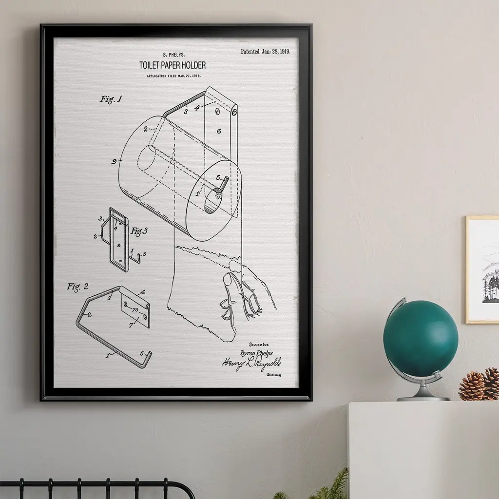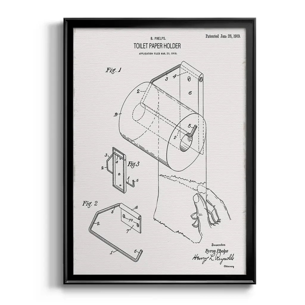 Toilet Paper Patent II Premium Framed Print - Ready to Hang A Premium Framed Print created to last. Framed in distressed wood and available in an array of sizes and colors Featuring a beveled a solid wood stretcher bar, each piece comes ready to hand 4 SIZES AVAILABLE 30.5''X42.5'' - Overall Size 26.5'X36.5'' - Overall Size 22.5''x30.5'' - Overall Size 18.5''x24.5'' - Overall Size Each piece is made to order. Each piece comes with hanging hardware. Made in the USA Ready to Hang