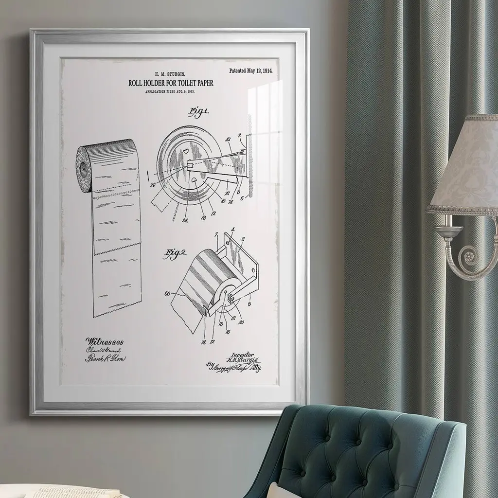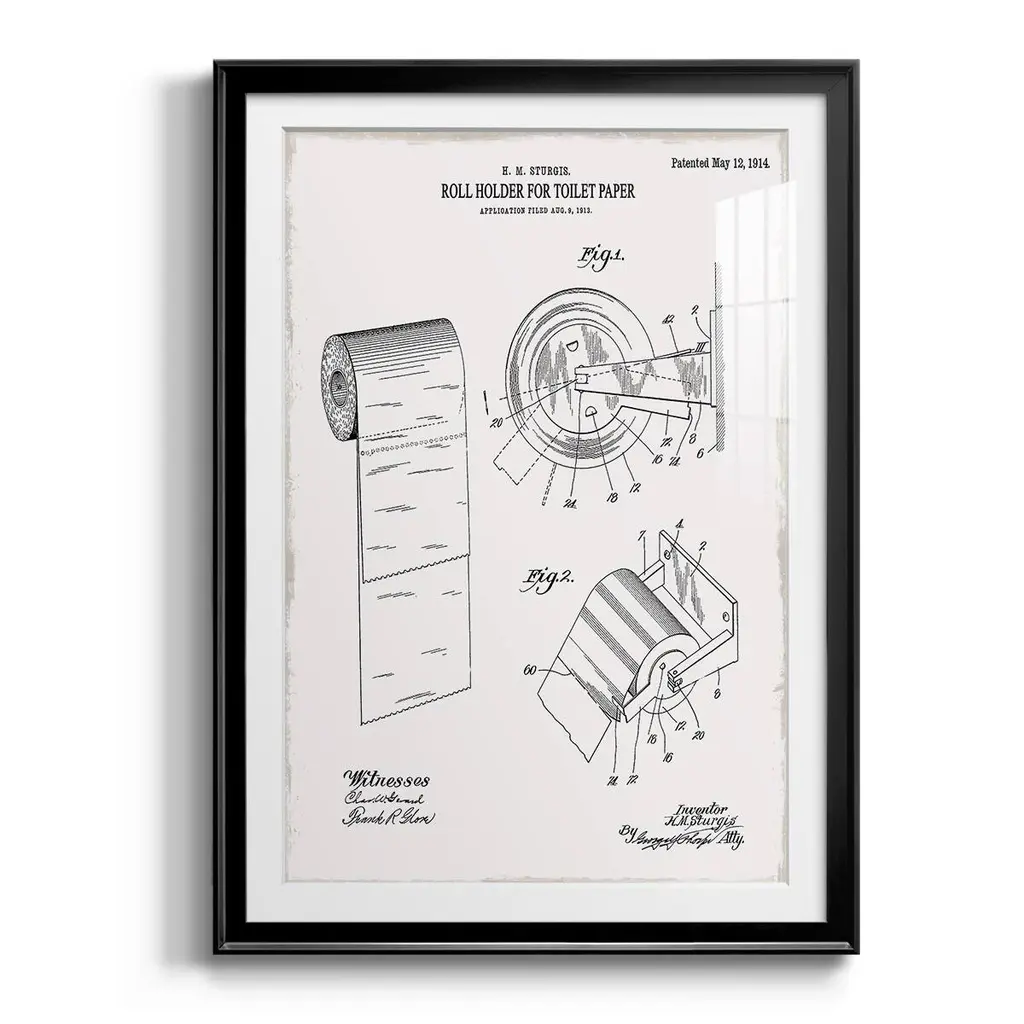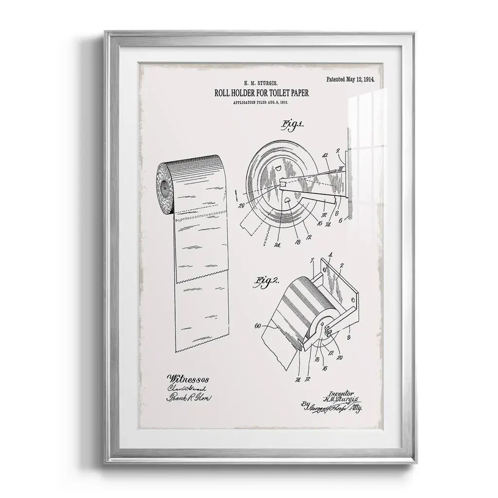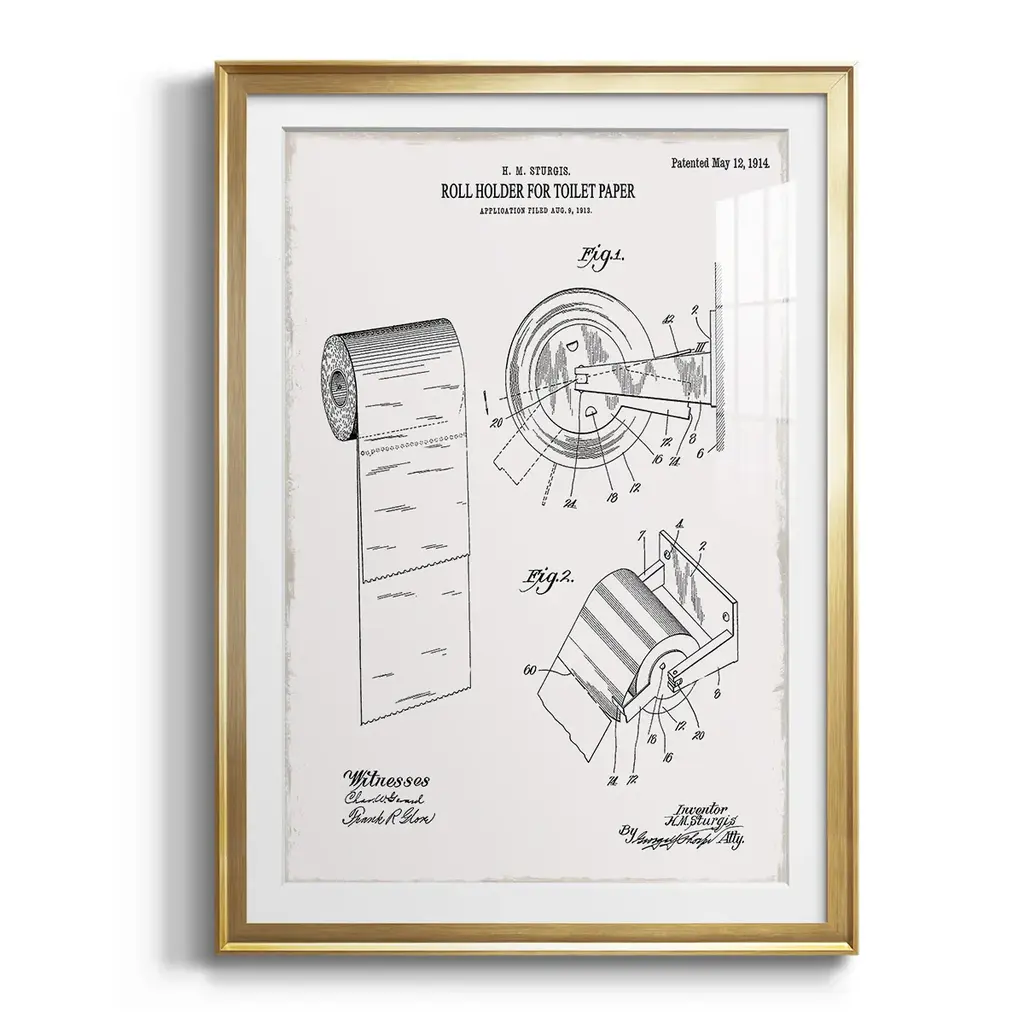 Toilet Paper Patent III Premium Framed Print - Ready to Hang A Premium Framed Print created to last. Framed in distressed wood and available in an array of sizes and colors Featuring a beveled a solid wood stretcher bar, each piece comes ready to hand 4 SIZES AVAILABLE 30.5''X42.5'' - Overall Size 26.5'X36.5'' - Overall Size 22.5''x30.5'' - Overall Size 18.5''x24.5'' - Overall Size Each piece is made to order. Each piece comes with hanging hardware. Made in the USA Ready to Hang Giclee Paper Print Acrylic Glass Beveled Matt Board