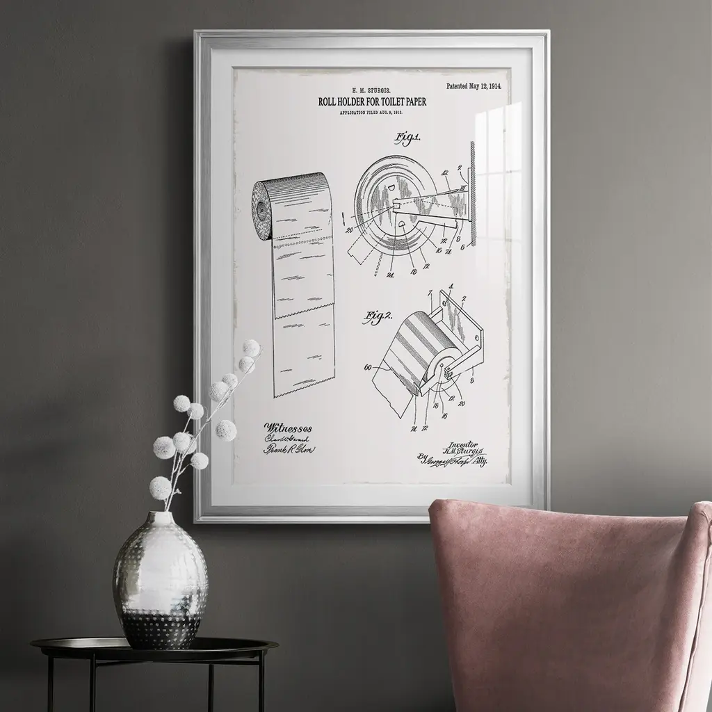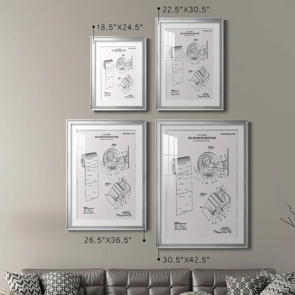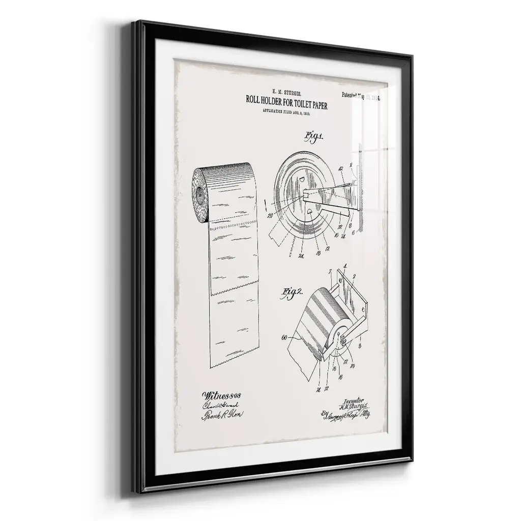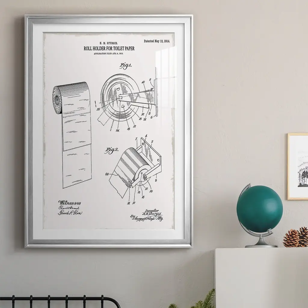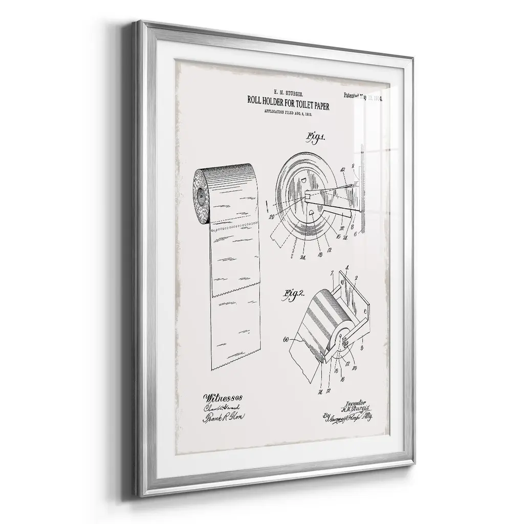 Toilet Paper Patent III Premium Framed Print - Ready to Hang A Premium Framed Print created to last. Framed in distressed wood and available in an array of sizes and colors Featuring a beveled a solid wood stretcher bar, each piece comes ready to hand 4 SIZES AVAILABLE 30.5''X42.5'' - Overall Size 26.5'X36.5'' - Overall Size 22.5''x30.5'' - Overall Size 18.5''x24.5'' - Overall Size Each piece is made to order. Each piece comes with hanging hardware. Made in the USA Ready to Hang Giclee Paper Print Acrylic Glass Beveled Matt Board