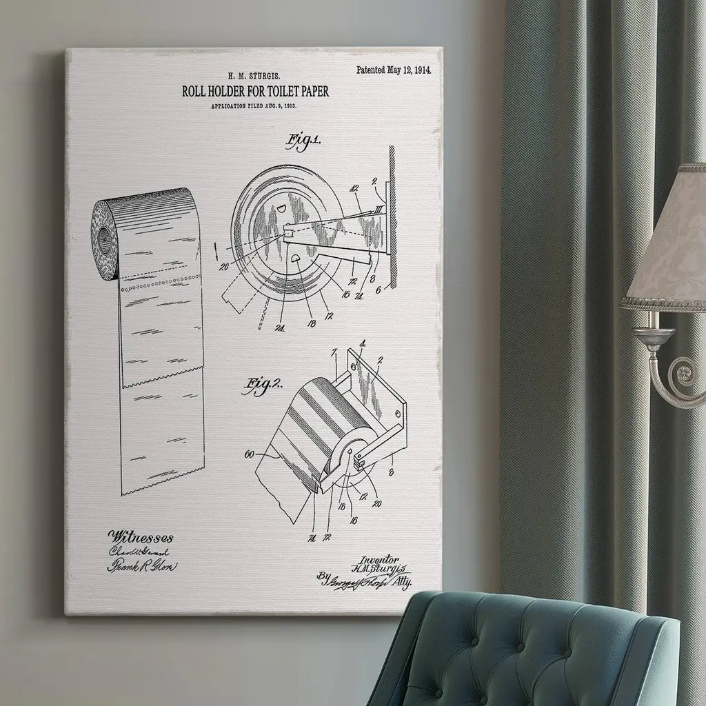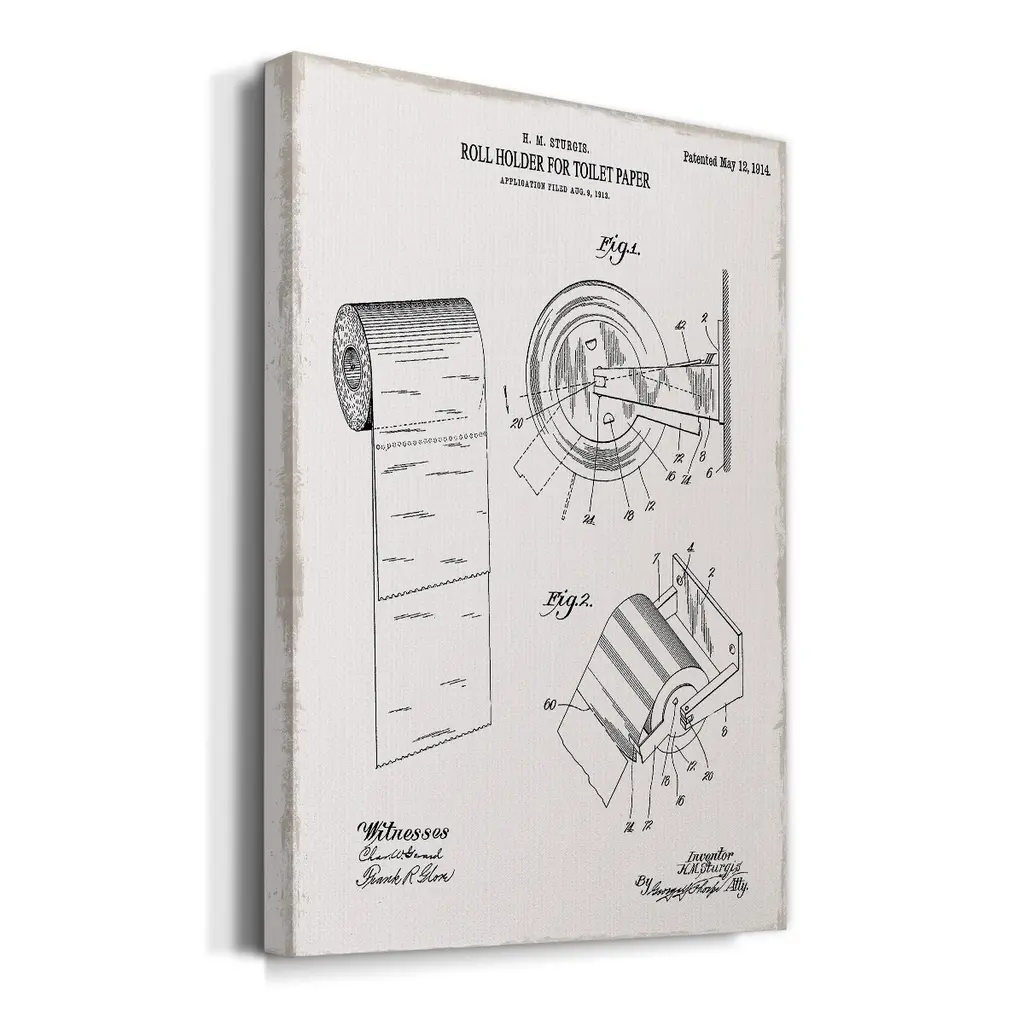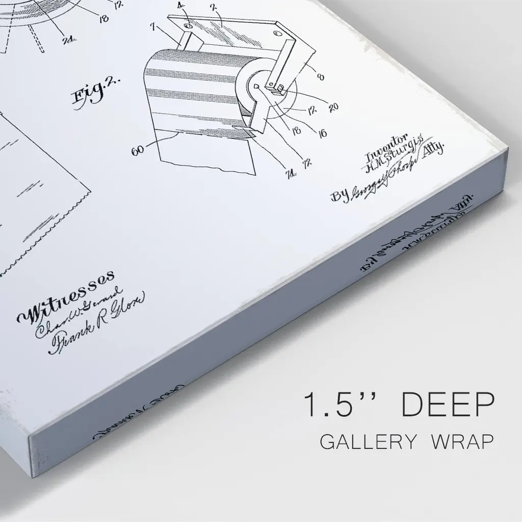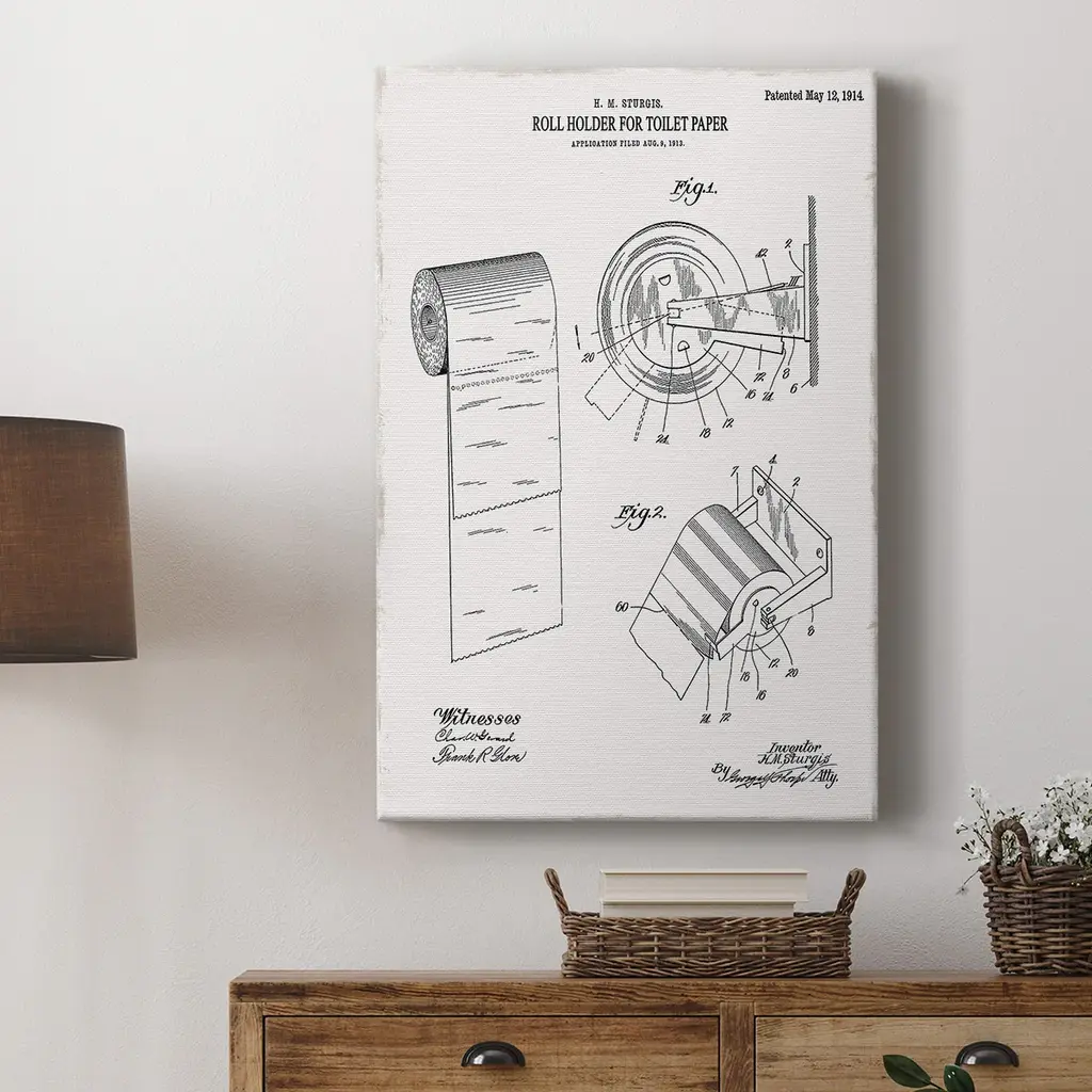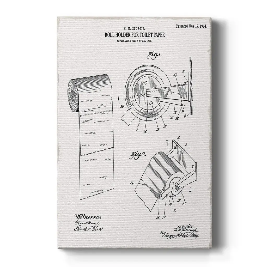 Toilet Paper Patent III Premium Gallery Wrapped Canvas - Ready to Hang A premium hand stretched gallery wrapped canvas print created to last. Featuring a beveled a solid wood stretcher bar, each piece comes ready to hand 6 SIZES AVAILABLE 8''X12'' - Overall Size 12''X18'' - Overall Size 18''X27'' - Overall Size 24''x36'' - Overall Size 32''x48'' - Overall Size 40''x60'' - Overall Size Each piece is made to order. Built to Last Each piece comes ready to hang Solid wood stretcher Fade and Water resistant Made domestically