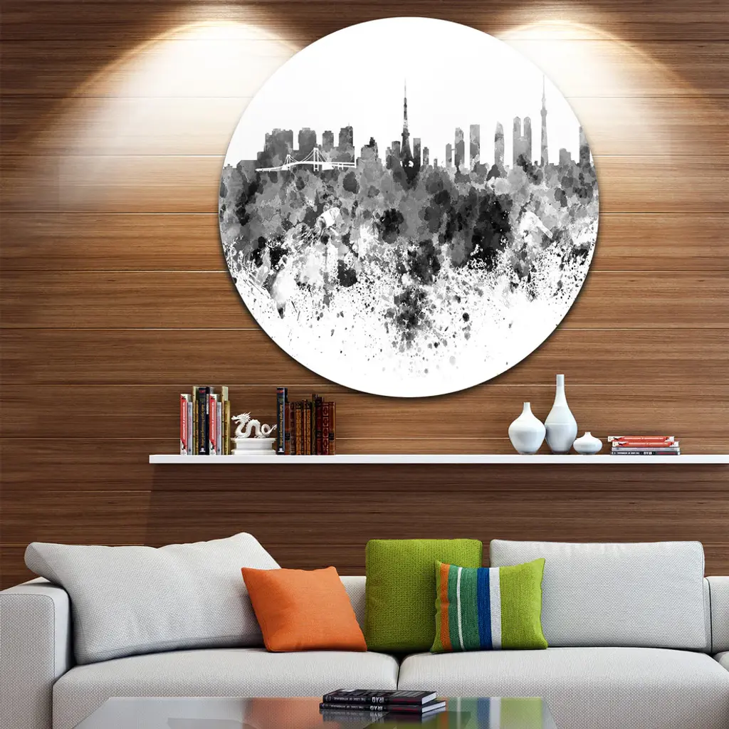 Bring Contemporary Abstraction to your home with this large Circle Metal wall art. This Tokyo Skyline Metal Artwork makes it the focal point of any room or office. - White Gloss Coating ensures colors are extra vibrant with light reflection.- Aluminum grade Sheet Metal with 1 inch mounting frame on the back giving the illusion that the artwork is floating on the wall..- Mounting Brackets are included along with instructions.- High Quality Digital images are created directly into a glossy aluminum panel producing a stunning and captivating print into the glossy finish of the metal.- Water, Fire and Scratch resistant HD Aluminum panels.- Looks better than any photo paper and guaranteed to last at least 20 years- Easy to clean with a microfiber cloth. Colors are far superior to regular Canvas Art. - Easy to Hang
