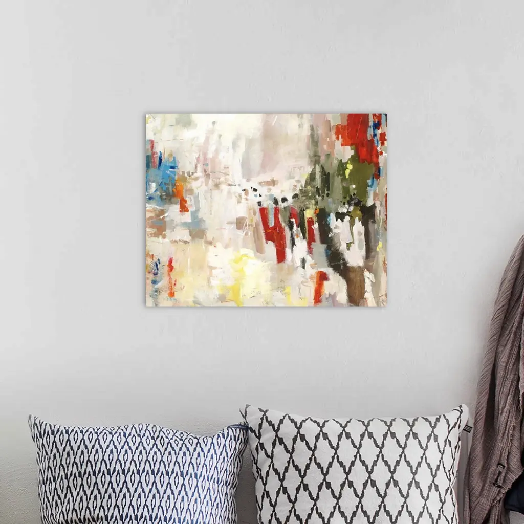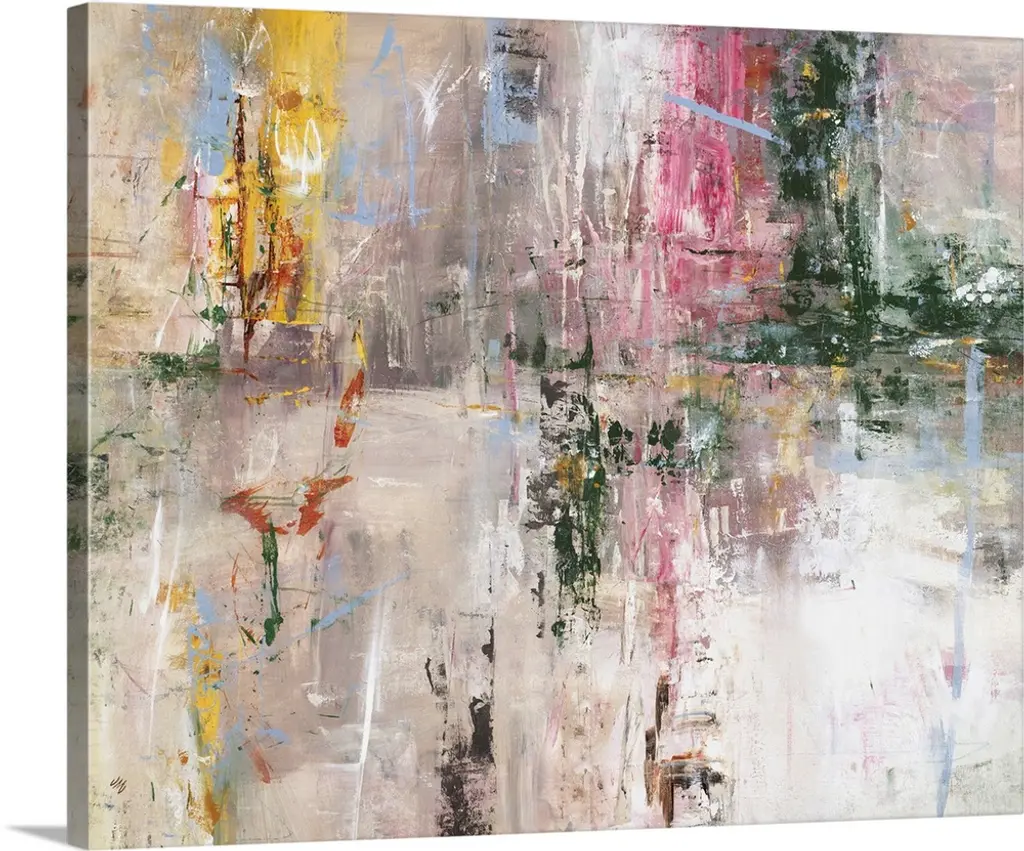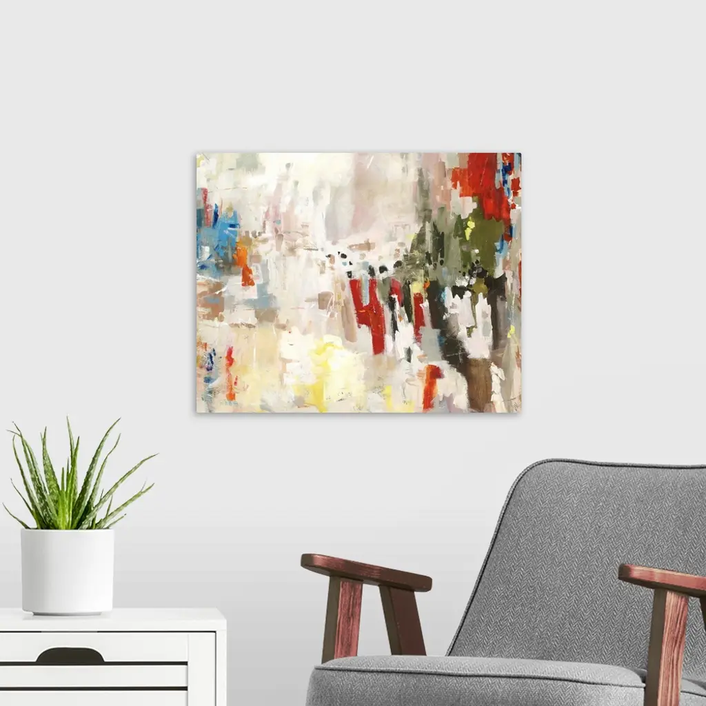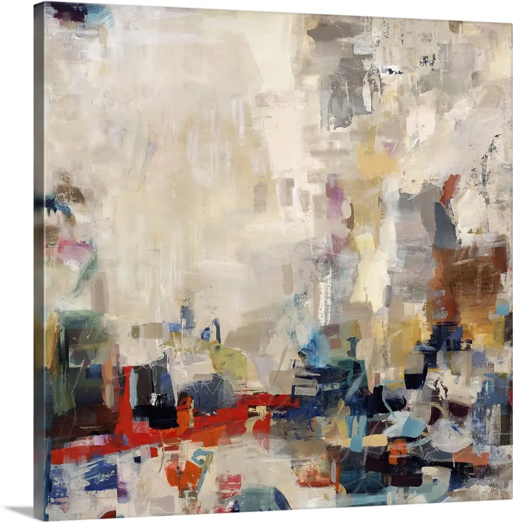 Abstract painting of many various vertical shapes in an array of colors that overlap and blend into larger areas of light neutral tones.