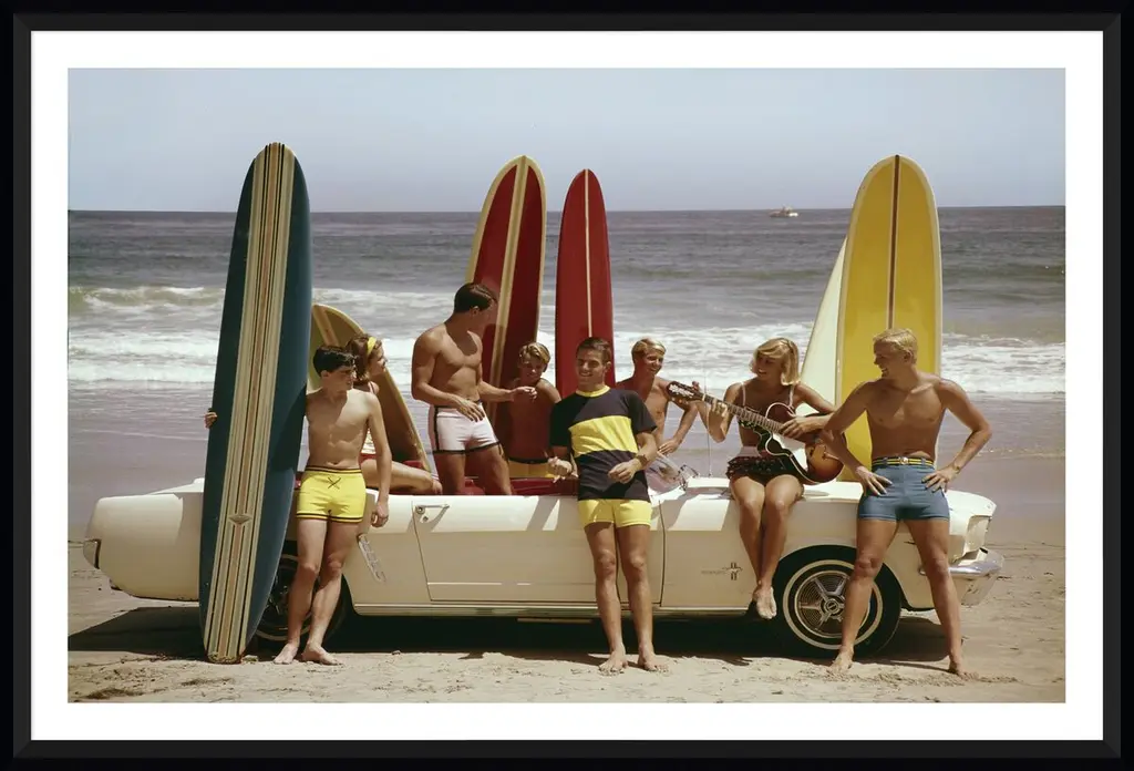 This 1964 image from Tom Kelley captures a cheerful group of young beachgoers as they pose with their surfboards and a Ford Mustang. Printed on high-quality paper and beautifully framed, this piece arrives ready to hang.
