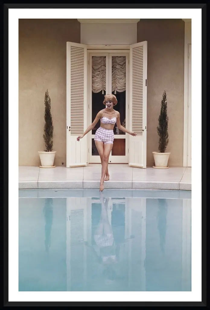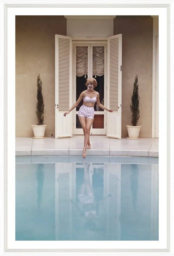 This photo of a playful woman in a gingham-check two-piece bathing suit recalls a halcyon 1960s summer. Printed on archival paper, it arrives framed and ready to hang.