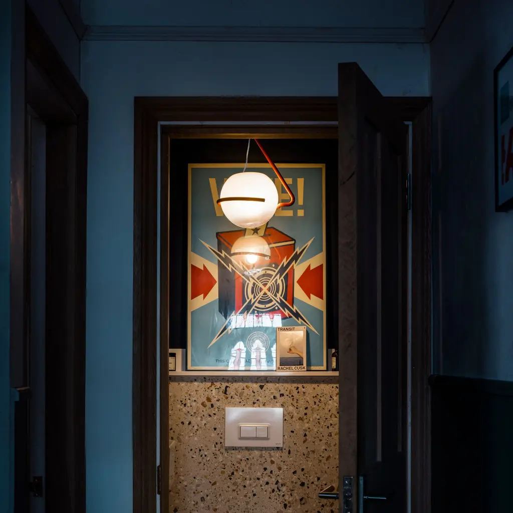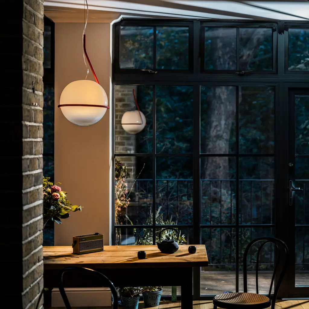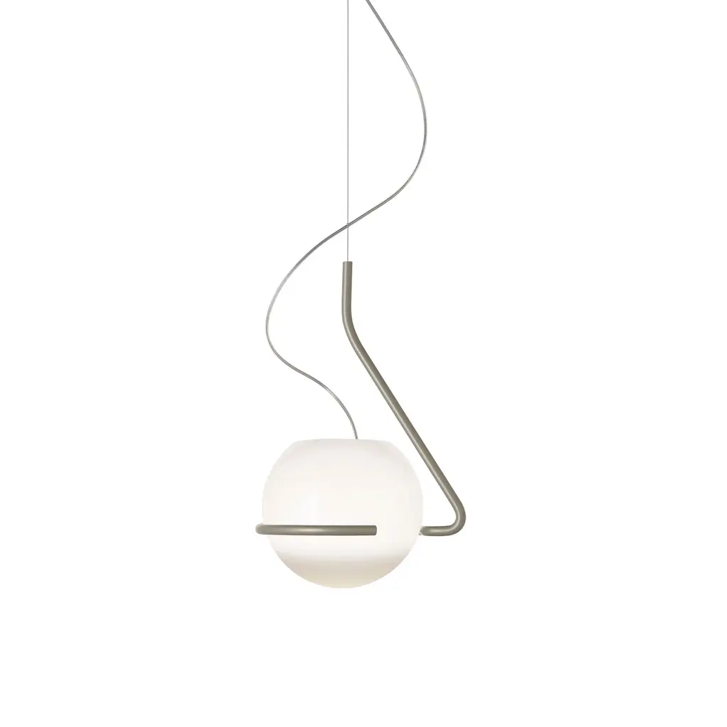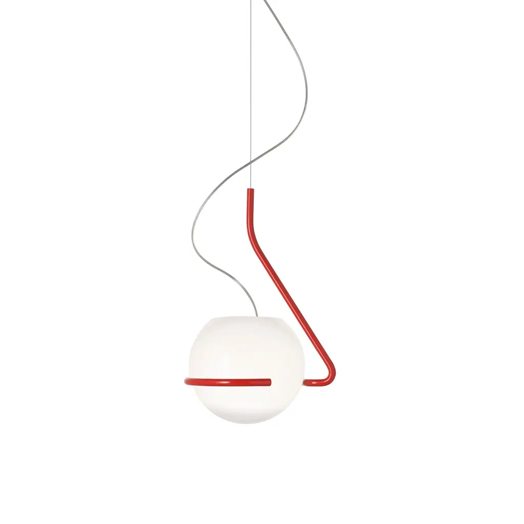 A mouth-blown globe floats inside a single bend of metal, as if someone sketched a pendant in one stroke and stopped at just the right moment. Ferruccio Laviani’s Tonda pairs artisan glass—white at the crown, gradually clearing toward the base—with an aluminum band that both cradles and balances the sphere. No two domes tint quite the same; each carries the slight drift of color that comes from hand work, so the light feels warmer, more lived-in, than a machine-perfect orb. From a distance you notice the line first: that clean, graphic loop framing the glass. Up close you see how the gradient shifts the beam—diffused glow above the ring, clear spill below. Choose the satin band in Matte White, Soft Grey, or Terra Red and hang the 12-inch or 16-inch globe over a dining table, reading corner, or entryway. A dimmable E26 LED keeps energy use low while letting the glass shine.