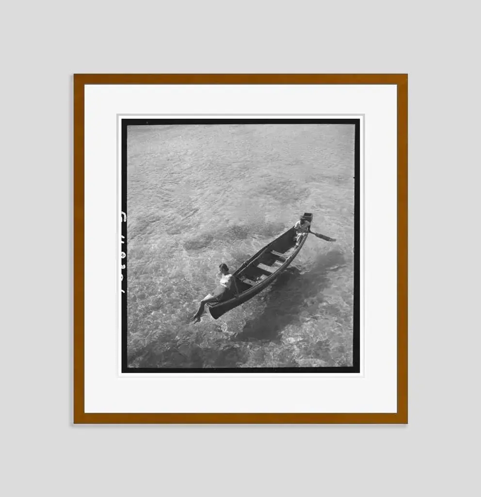 Model In Montego Bay 1946 by Toni Frissell Fashion model bein rowed across Montego Bay, Jamaica, 1946. Antoinette Frissell Bacon (March 10, 1907 – April 17, 1988), known as Toni Frissell, was an American photographer, known for her fashion photography, World War II photographs, and portraits of famous Americans, Europeans, children, and women from all walks of life. Paper size - 20 x 20 inches / 50 x 50 cm Approximate frame size - 27 x 27 inches / 68 x 68 cm c print Framed in brown solid wood frame with mount and glazing - ready to hang Printed later I have official proof of authenticity such as vintage catalogs, designer records, or other literature sources and take full responsibility for any authenticity issues arising from misattribution