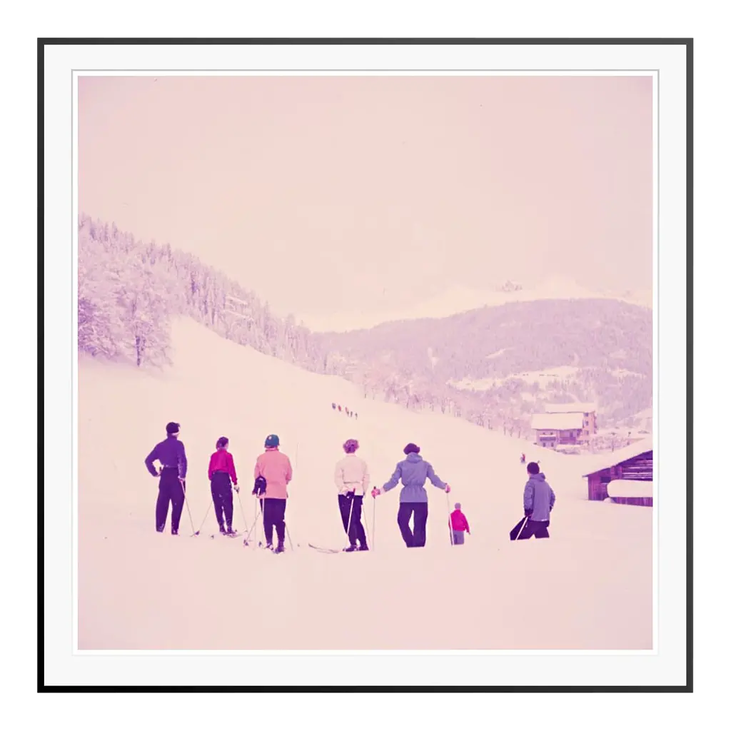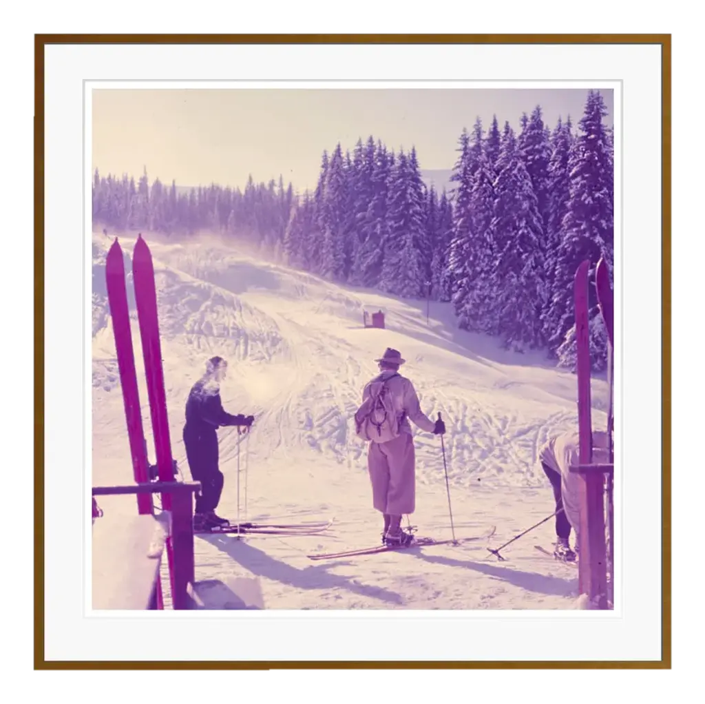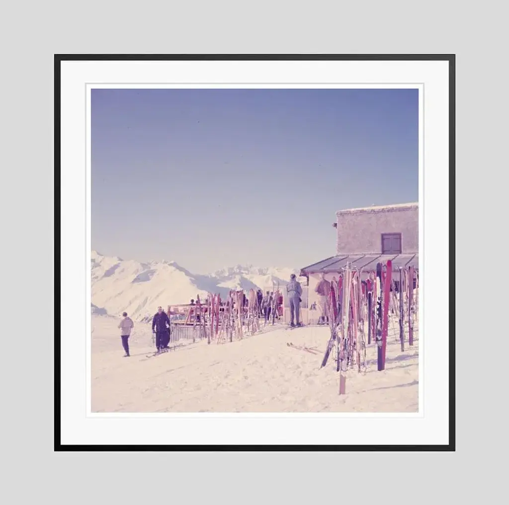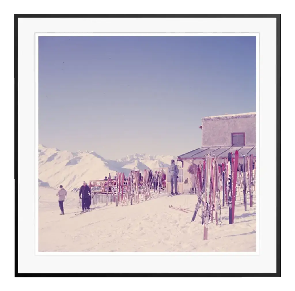 Mountain Top 1951 by Toni Frissell Skis stacked up at a mountain top terrace, Klosters, Switzerland, 1951. Antoinette Frissell Bacon (March 10, 1907 – April 17, 1988), known as Toni Frissell, was an American photographer, known for her fashion photography, World War II photographs, and portraits of famous Americans, Europeans, children, and women from all walks of life. Paper size - 20 x 20 inches / 50 x 50 cm Approximate frame size - 27 x 27 inches / 68 x 68 cm c print Framed in Black solid wood frame with mount and glazing - ready to hang Printed later I have official proof of authenticity such as vintage catalogs, designer records, or other literature sources and take full responsibility for any authenticity issues arising from misattribution