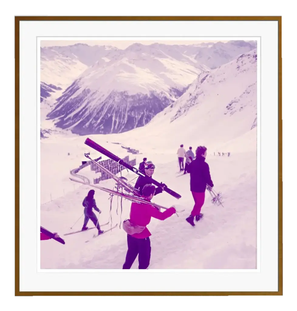 Mountain Top 1951 by Toni Frissell A skier checks their skis at a mountain top terrace, Klosters, Switzerland, 1951. Antoinette Frissell Bacon (March 10, 1907 – April 17, 1988), known as Toni Frissell, was an American photographer, known for her fashion photography, World War II photographs, and portraits of famous Americans, Europeans, children, and women from all walks of life. Paper size - 20 x 20 inches / 50 x 50 cm Approximate frame size - 27 x 27 inches / 68 x 68 cm c print Framed in Brown solid wood frame with mount and glazing - ready to hang Printed later I have official proof of authenticity such as vintage catalogs, designer records, or other literature sources and take full responsibility for any authenticity issues arising from misattribution