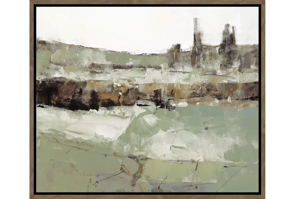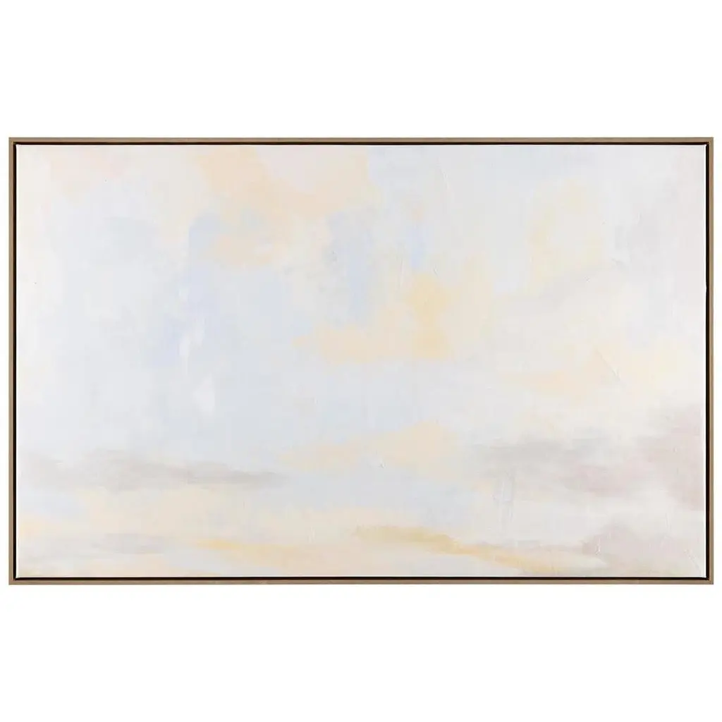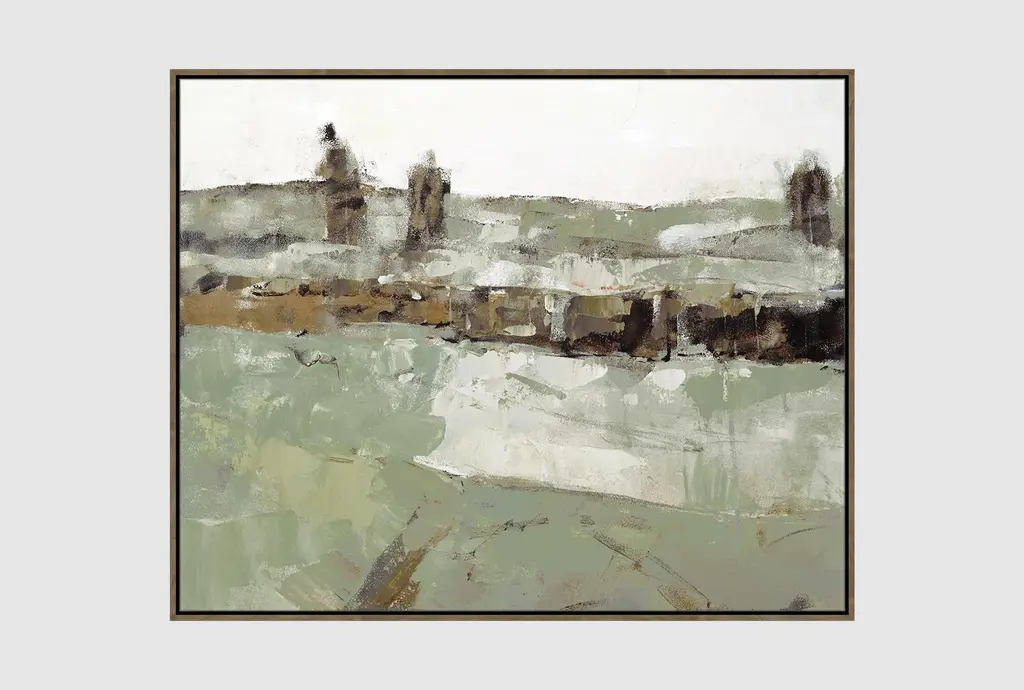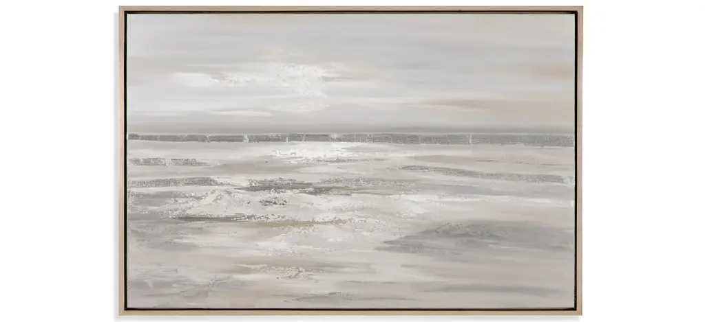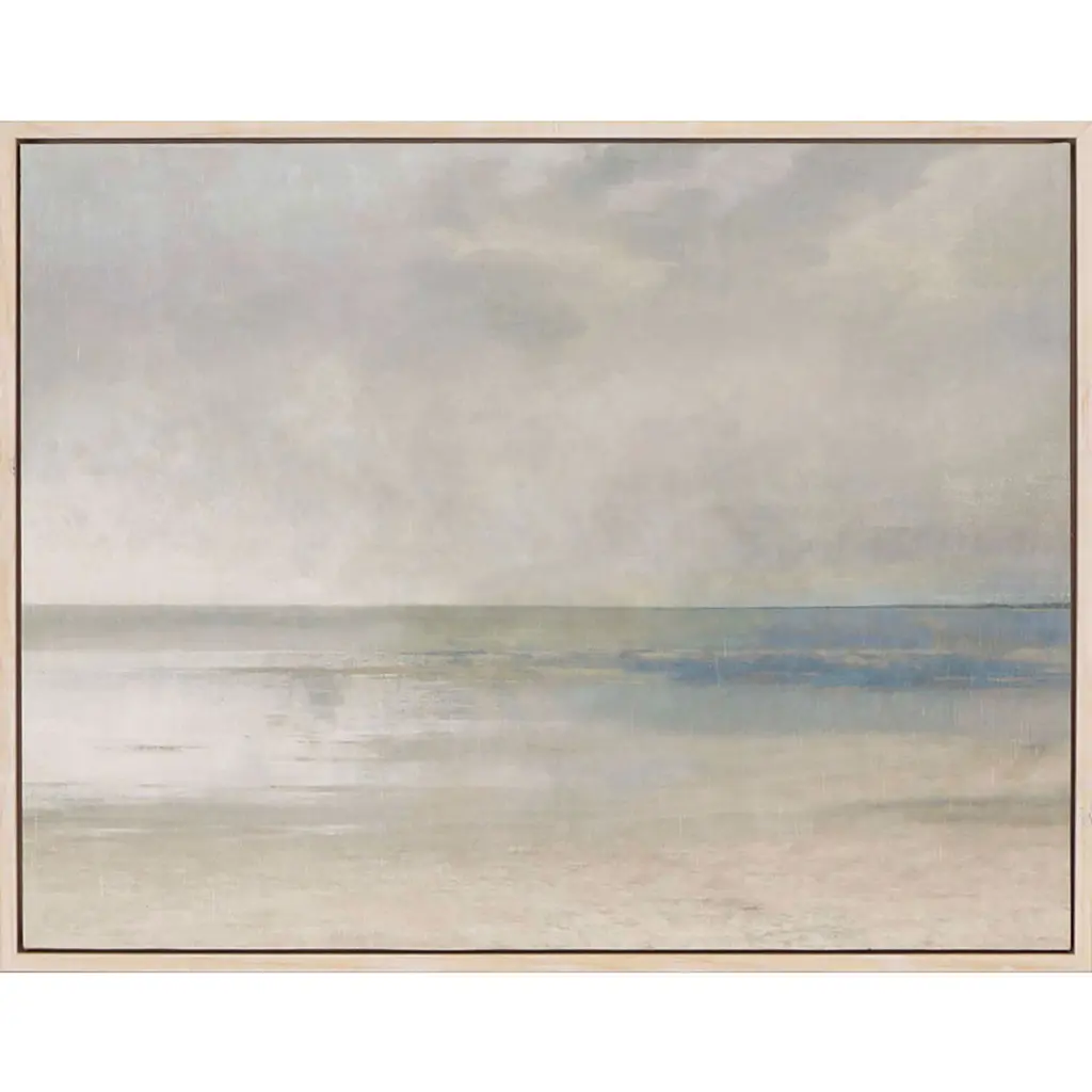 Hushed Horizon by artist Tony Fey is an introspective oil painting on canvas, showcasing an open field in ephemeral tones and a vast horizon of gray skies. This beautiful artwork is displayed from a silver floater frame.