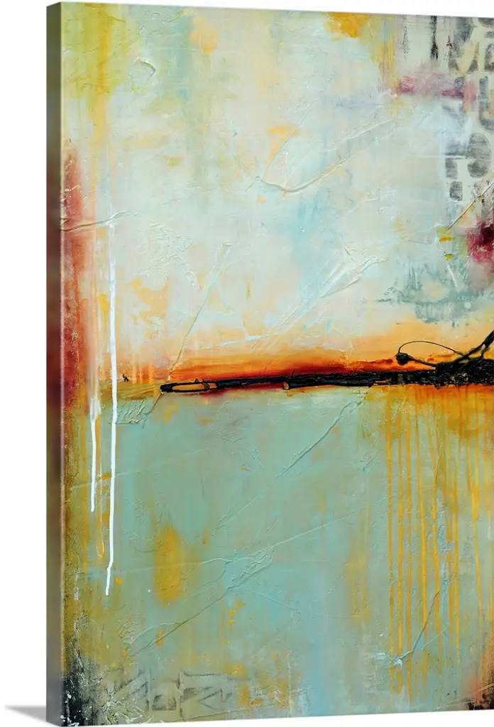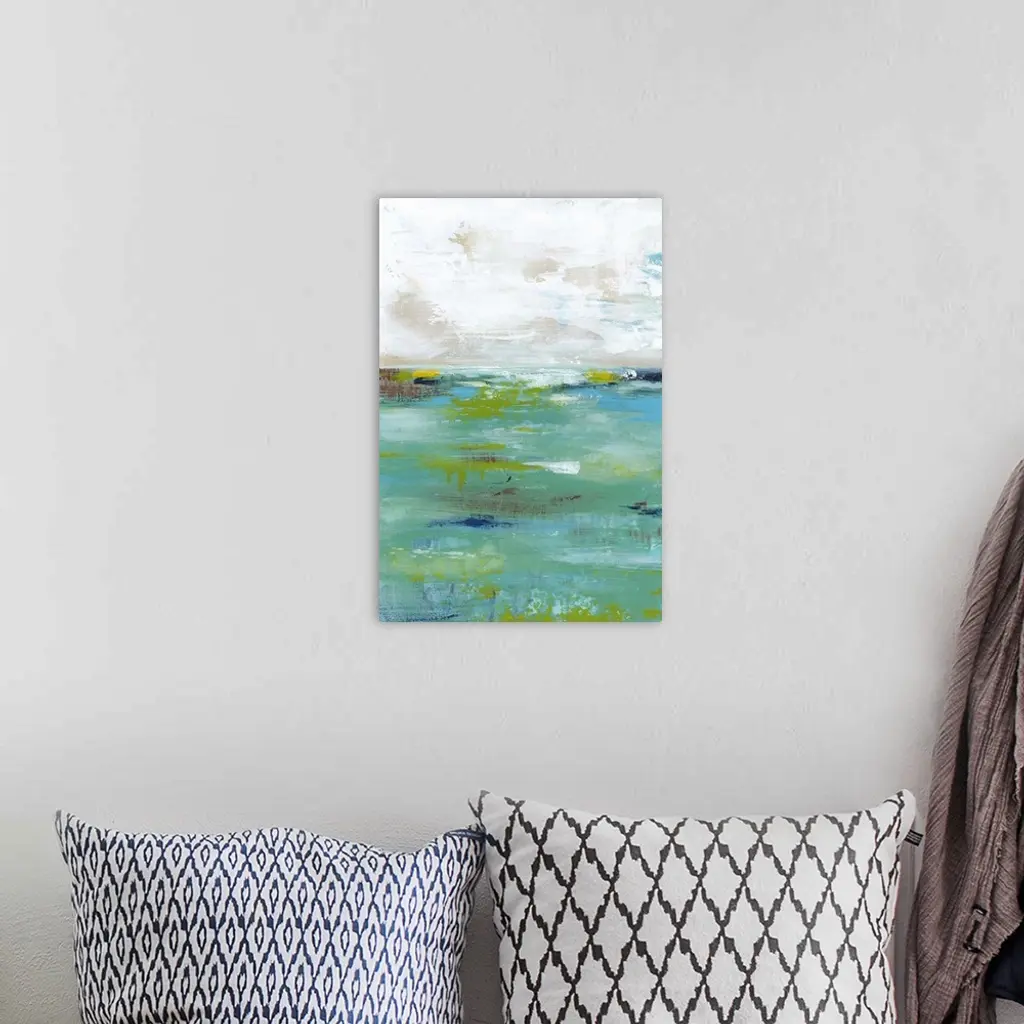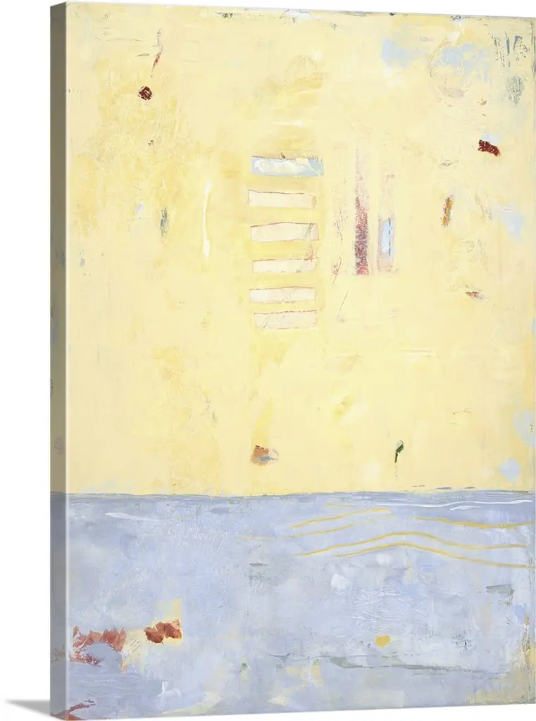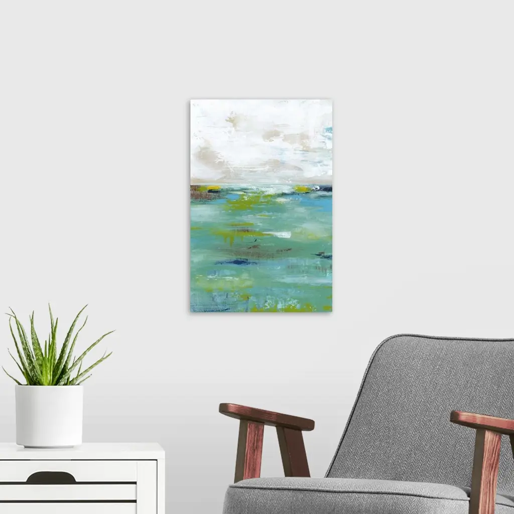Abstract painting resembling a body of water meeting the sky at the horizon.