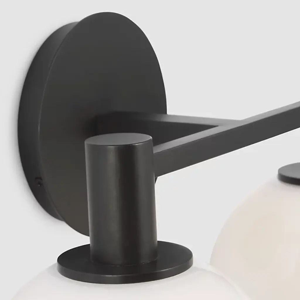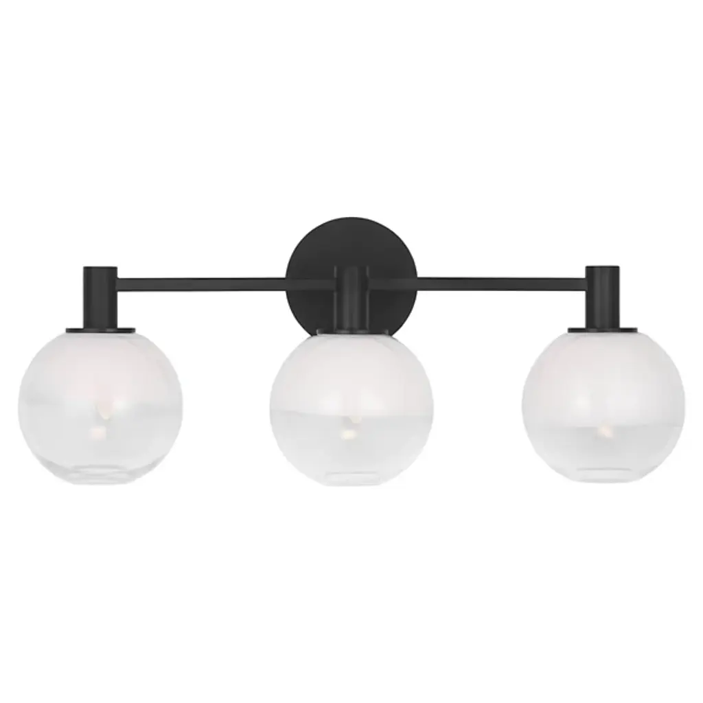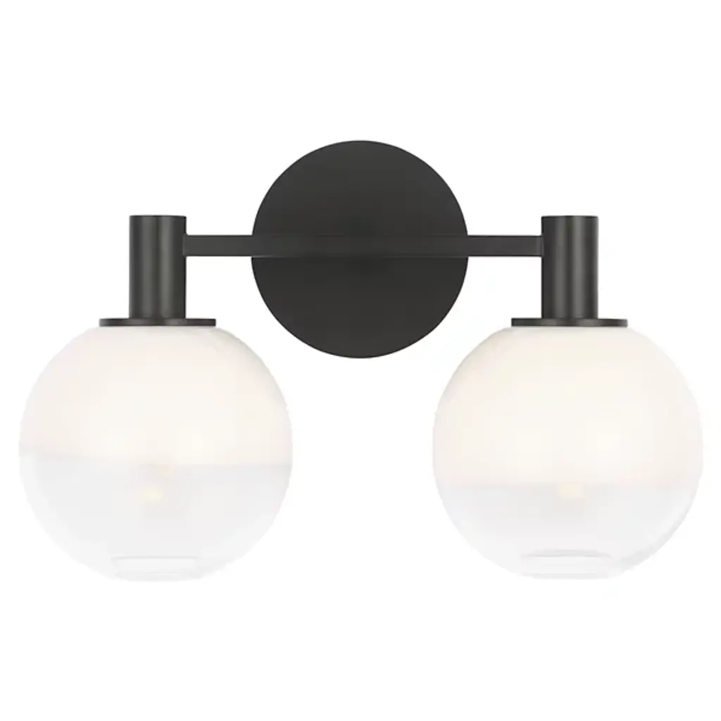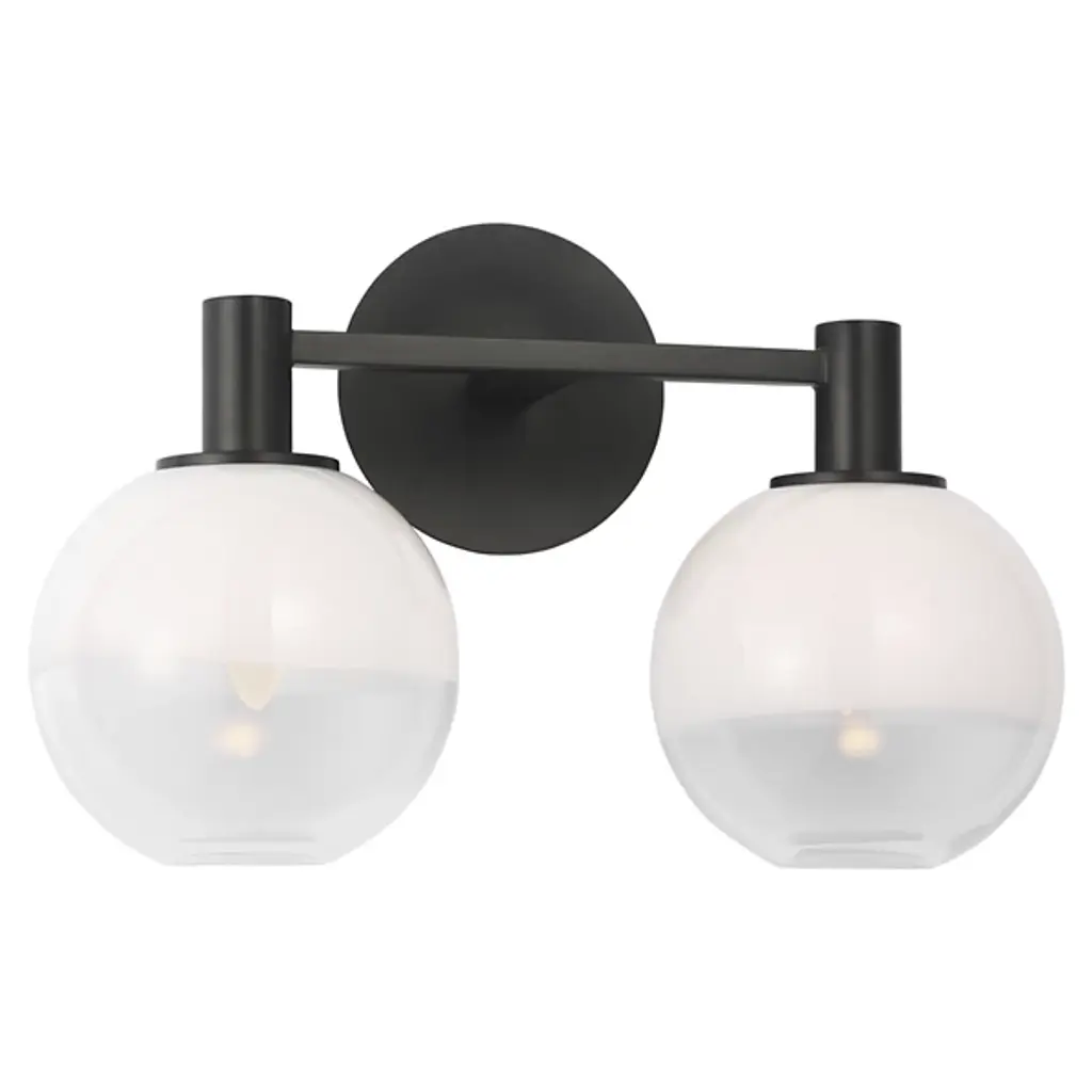 The Torian Vanity Light from Visual Comfort Studio features spherical glass shades with a distinctive two-tone appearance--milky on top and clear on the bottom. This wall-mounted fixture positions the globe lights horizontally from a circular backplate, creating a balanced, architectural presence. Its steel frame provides a sturdy foundation, allowing the unique ombre glass to be the focal point. Sean Lavin's thoughtfully proportioned fixture works especially well in bathroom settings but is equally at home in hallways and bedrooms, where its sculptural qualities can be appreciated throughout the day, even when not illuminated.