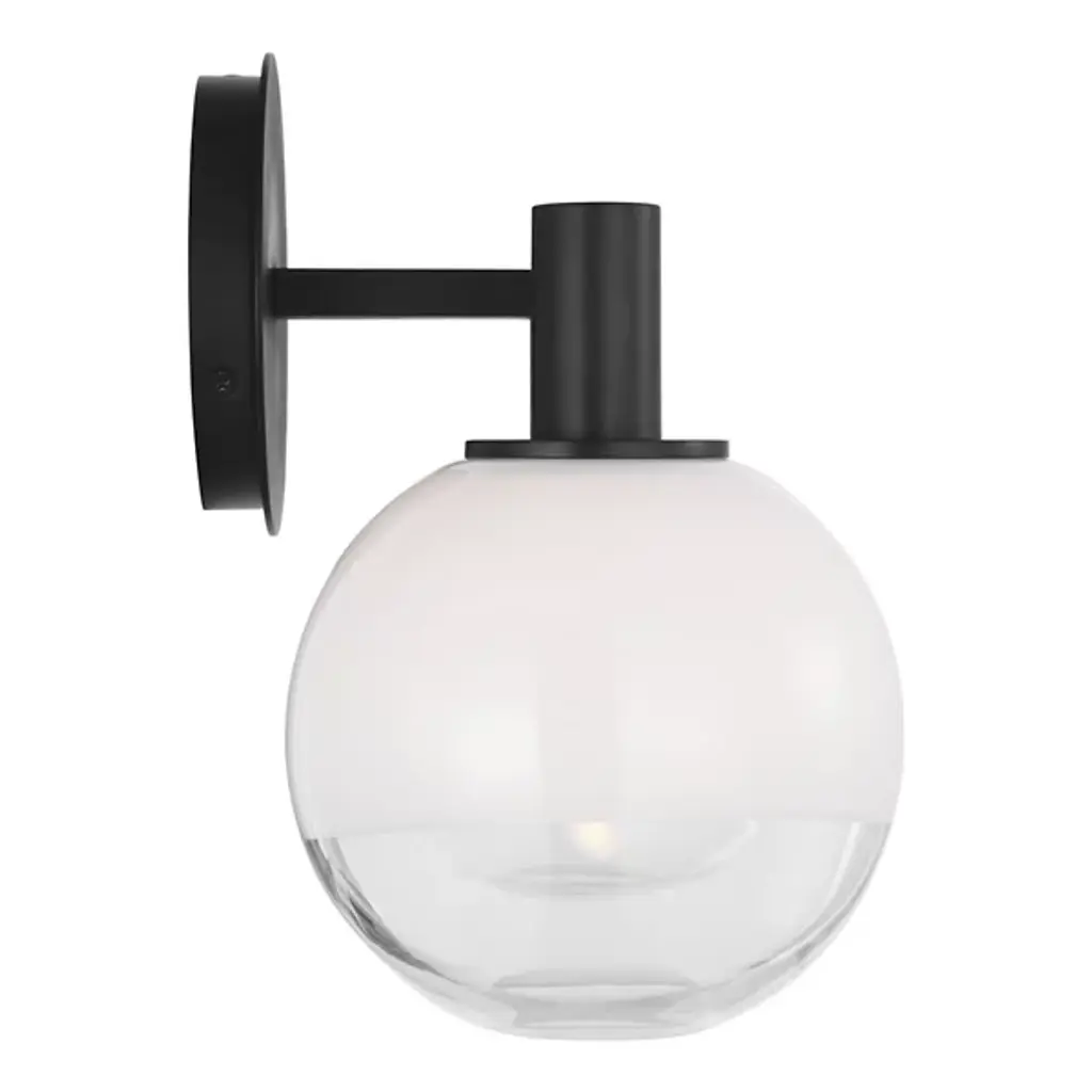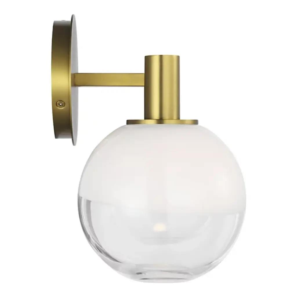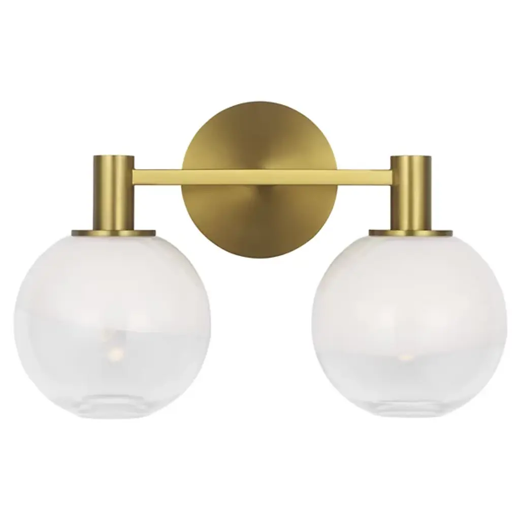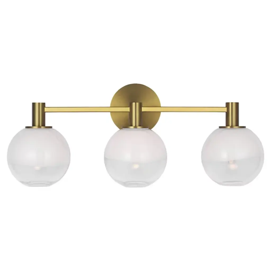 The Torian Vanity Light from Visual Comfort Studio features spherical glass shades with a distinctive two-tone appearance--milky on top and clear on the bottom. This wall-mounted fixture positions the globe lights horizontally from a circular backplate, creating a balanced, architectural presence. Its steel frame provides a sturdy foundation, allowing the unique ombre glass to be the focal point. Sean Lavin's thoughtfully proportioned fixture works especially well in bathroom settings but is equally at home in hallways and bedrooms, where its sculptural qualities can be appreciated throughout the day, even when not illuminated.