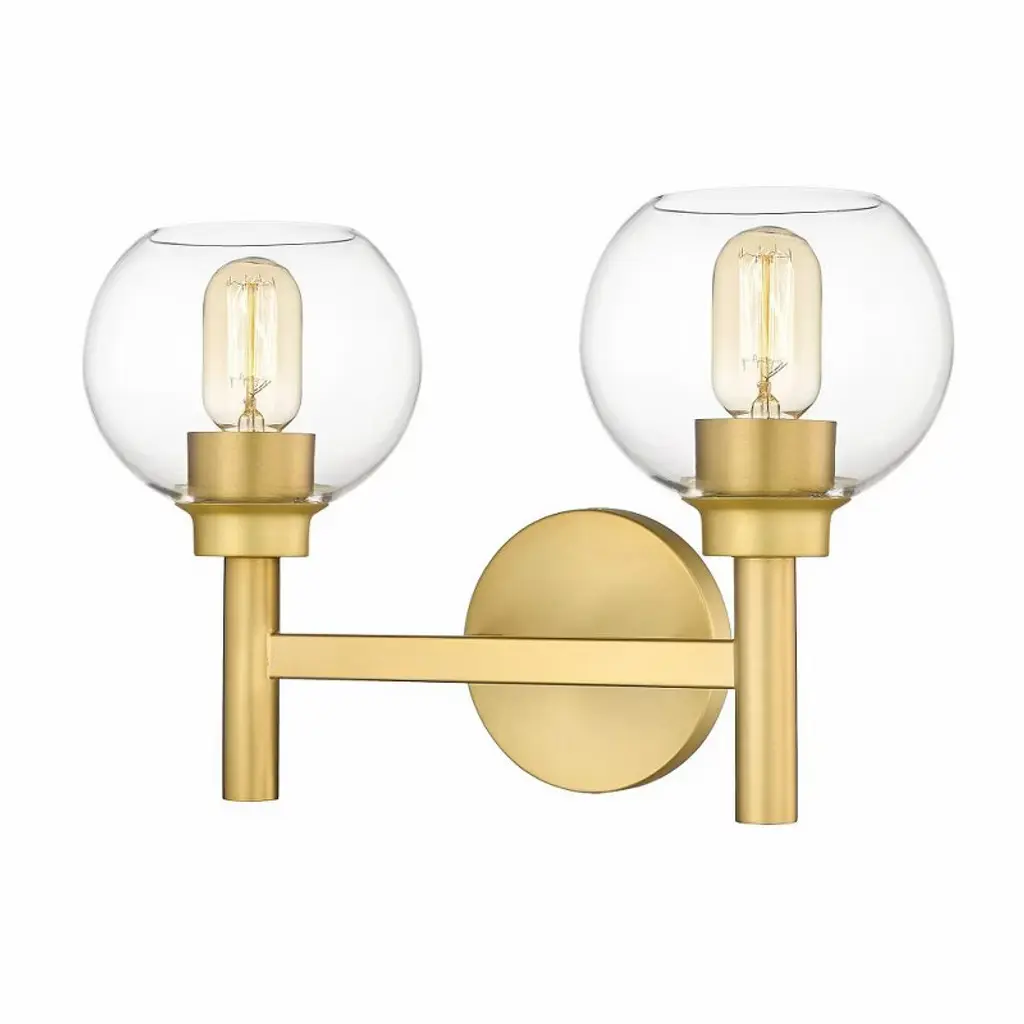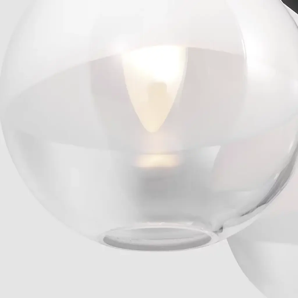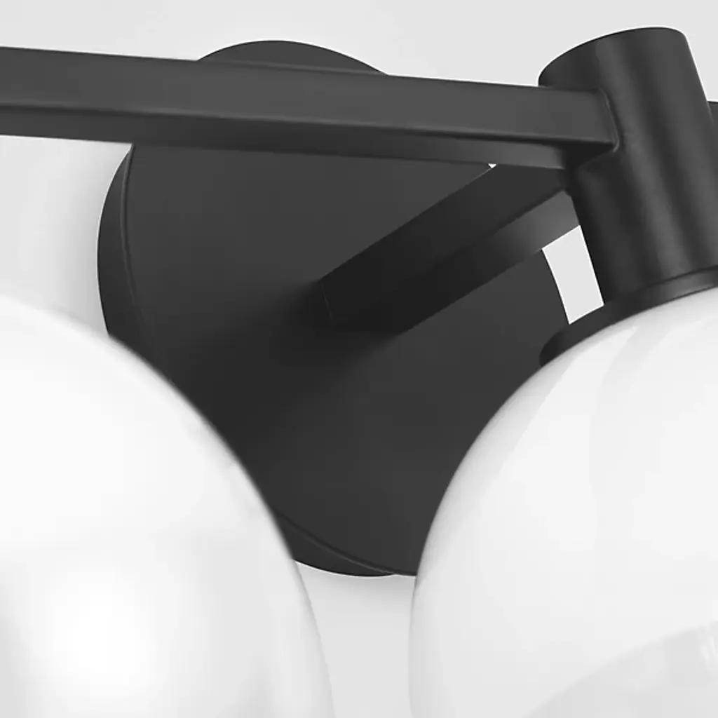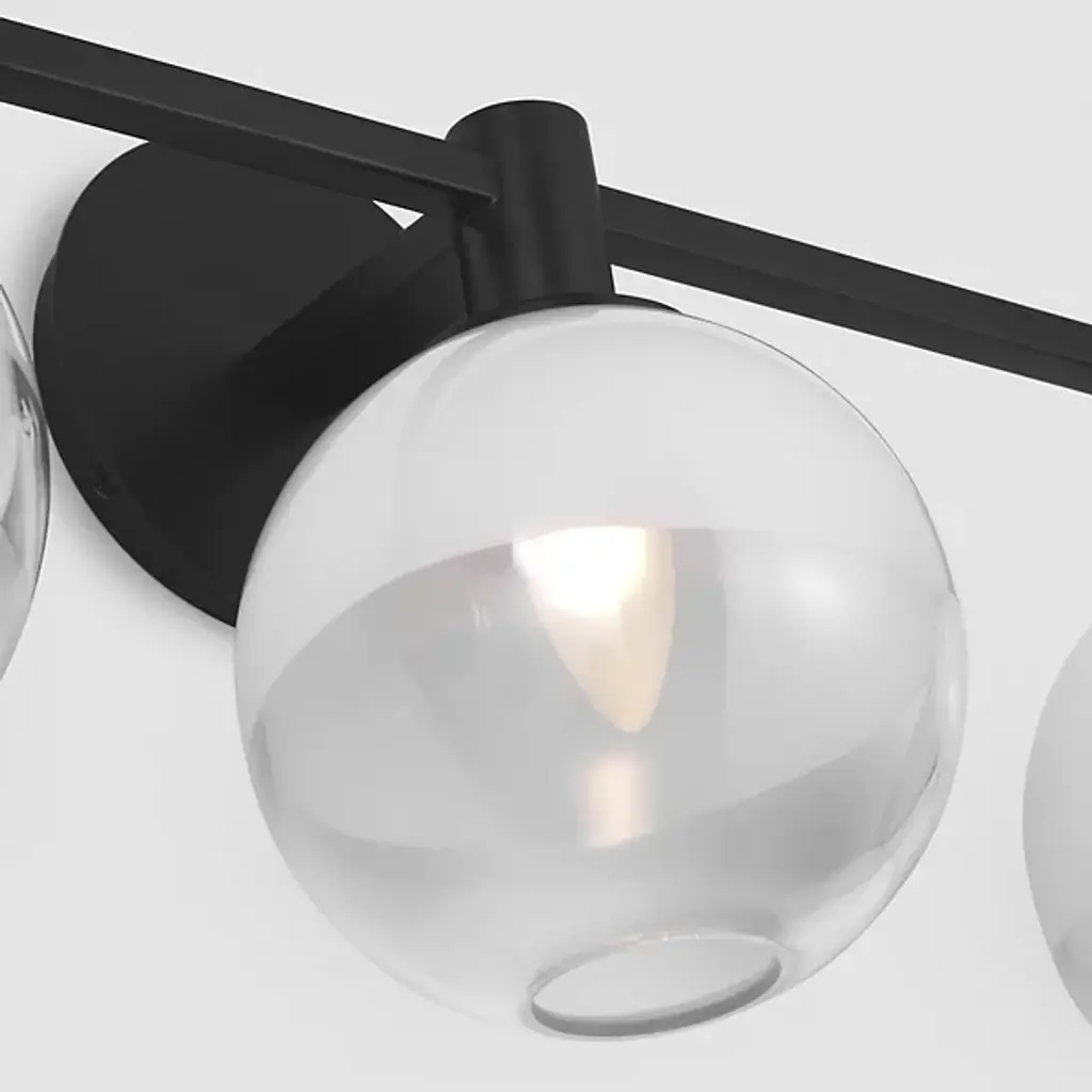 The Torian Vanity Light from Visual Comfort Studio features spherical glass shades with a distinctive two-tone appearance--milky on top and clear on the bottom. This wall-mounted fixture positions the globe lights horizontally from a circular backplate, creating a balanced, architectural presence. Its steel frame provides a sturdy foundation, allowing the unique ombre glass to be the focal point. Sean Lavin's thoughtfully proportioned fixture works especially well in bathroom settings but is equally at home in hallways and bedrooms, where its sculptural qualities can be appreciated throughout the day, even when not illuminated.