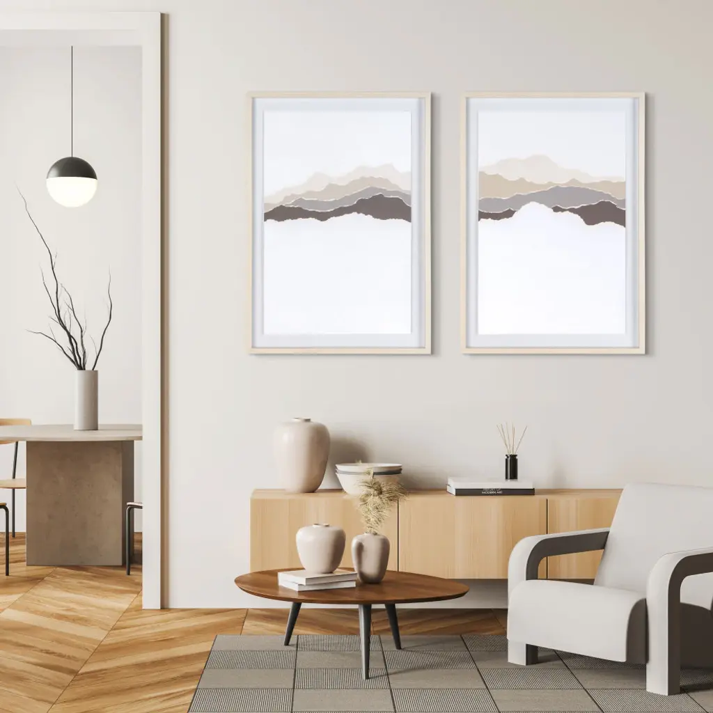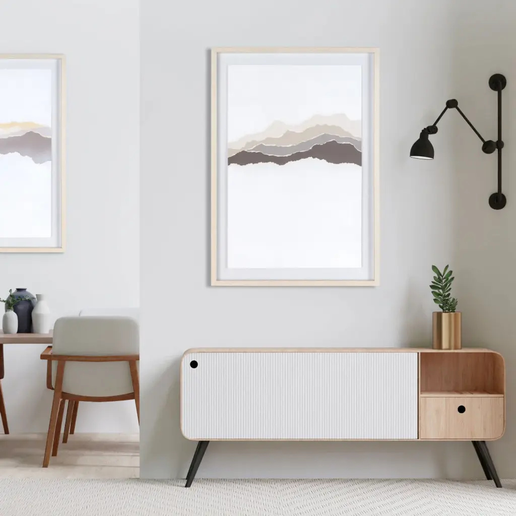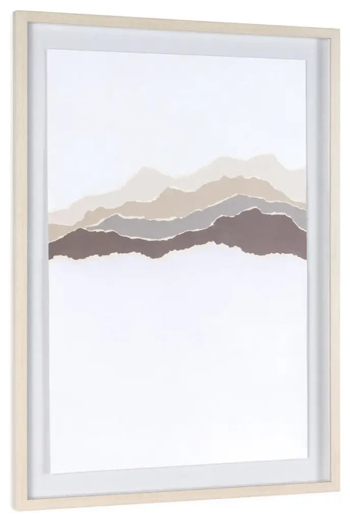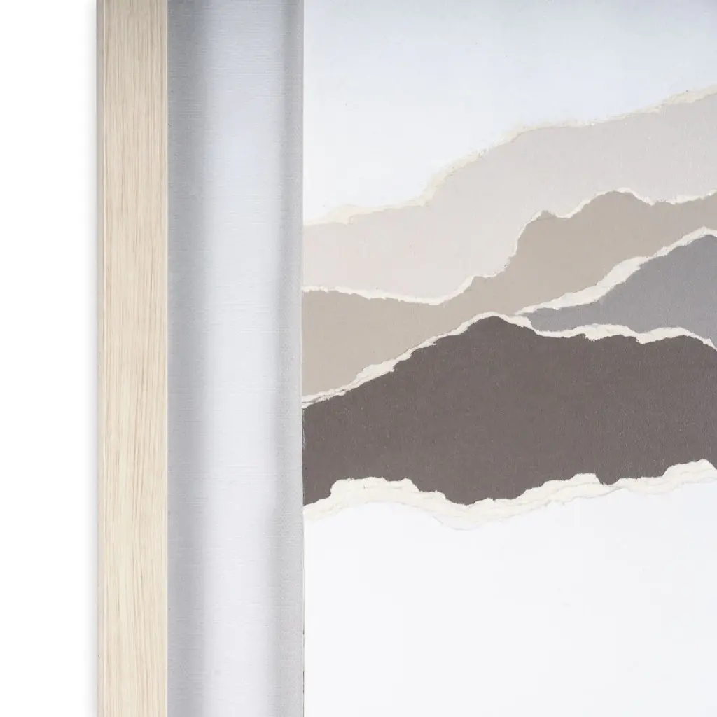 Step into a realm of visual poetry with this striking shadow box artwork, measuring 26" x 2" x 37". A symphony of earthy neutrals dances across torn paper, coalescing into an abstract mountain panorama that stirs the imagination. Encased in a polycomposite frame with the subtle warmth of light-colored wood, protected by sleek plexiglass, each piece is a testament to modern sophistication. While sold separately, they harmonize effortlessly when paired, creating a unified statement that elevates any space with contemporary allure.Earthy neutral tones converge in a harmonious blend, evoking the serene beauty of natural landscapesWith dimensions of 26" x 2" x 37", it offers a substantial yet tasteful presence, making a notable addition to any spaceIndividualistic yet Unified: Each piece sold separately but thoughtfully designed to complement its counterpart, allowing for endless possibilities in creating a cohesive and dynamic displayReady to hang using pre-attached hooks