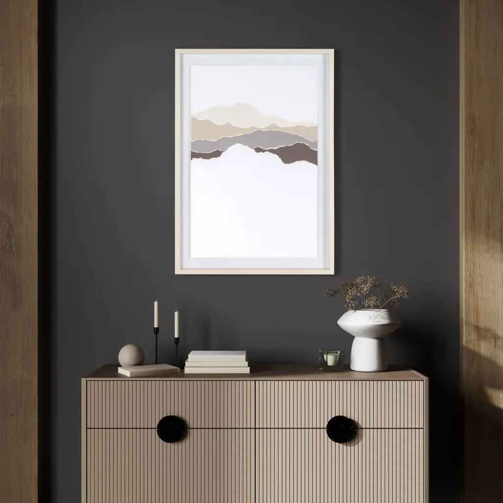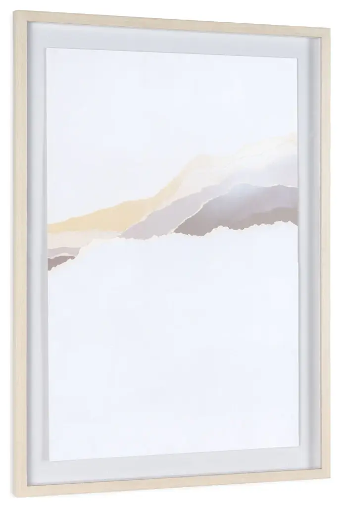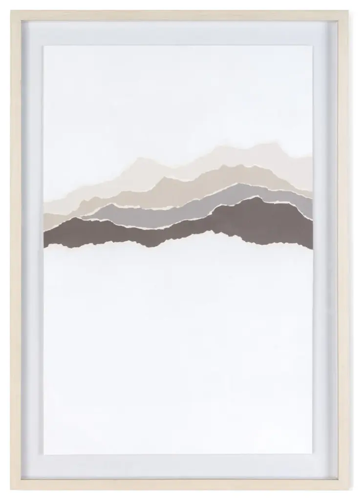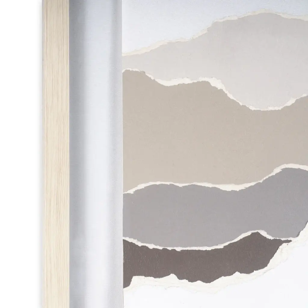 Step into a realm of visual poetry with this striking shadow box artwork, measuring 26" x 2" x 37". A symphony of earthy neutrals dances across torn paper, coalescing into an abstract mountain panorama that stirs the imagination. Encased in a polycomposite frame with the subtle warmth of light-colored wood, protected by sleek plexiglass, each piece is a testament to modern sophistication. While sold separately, they harmonize effortlessly when paired, creating a unified statement that elevates any space with contemporary allure.Earthy neutral tones converge in a harmonious blend, evoking the serene beauty of natural landscapesWith dimensions of 26" x 2" x 37", it offers a substantial yet tasteful presence, making a notable addition to any spaceIndividualistic yet Unified: Each piece sold separately but thoughtfully designed to complement its counterpart, allowing for endless possibilities in creating a cohesive and dynamic displayReady to hang using pre-attached hooks