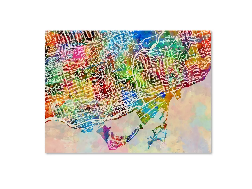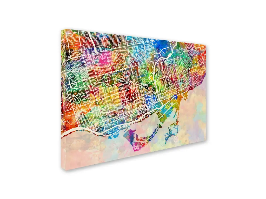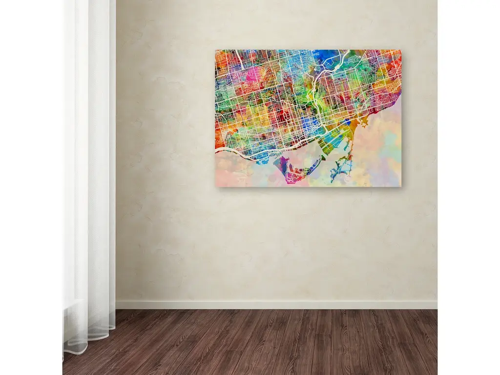 Title: Toronto Street MapArtist: Michael TompsettProduct Type: Canvas ArtSize: 14" x 19"Made in the USA.Art and design were always Michael's favorite subjects at school. He was fortunate to land a job as a graphic designer at one of London's most prestigious publishing companies. After 12 years Michael Tompsett made the decision to pursue a full-time career creating his own work. The freedom and time to be able to focus solely on his own projects has been a wonderful experience. Although Michael likes to experiment with different styles and subjects, his main focus is on map art. He enjoys looking for unique and interesting ways to depict something familiar. Maps are visual representations of the world we live in, a world which is incredibly diverse. Apart from maps, Tompsett creates urban landmark and cityscape designs.This 14" x 19" canvas art is ready to hang. Giclee (jee-clay) is an advanced printmaking process for creating high quality fine art reproductions. The attainable excellence that Giclee printmaking affords makes the reproduction virtually indistinguishable from the original piece. The result is wide acceptance of Giclee by galleries, museums, and private collectors. Gallery wrap is a method of stretching an artist's canvas so that the canvas wraps around the sides and is secured to a hidden, wooden frame. This method of stretching and preparing a canvas allows for a frameless presentation of the finished print.Materials: Canvas: 100% Cotton, Stretcher Bars: Poplar