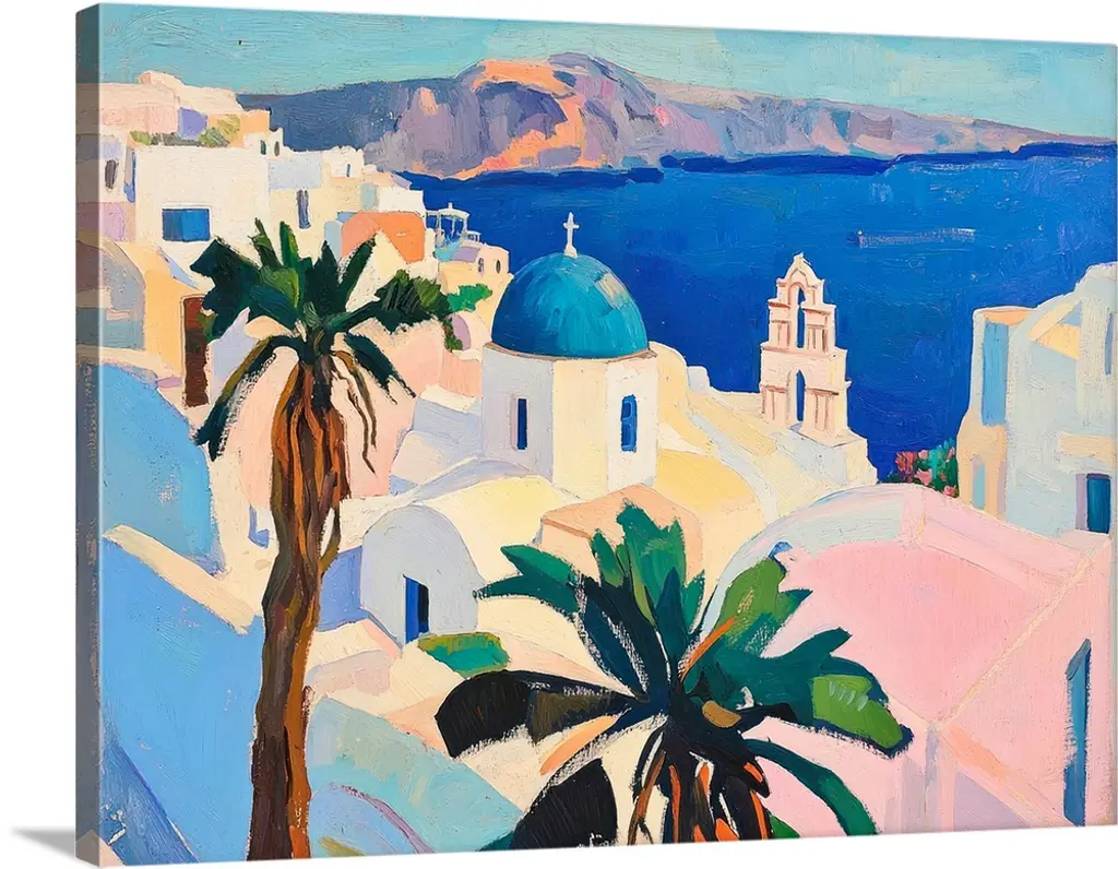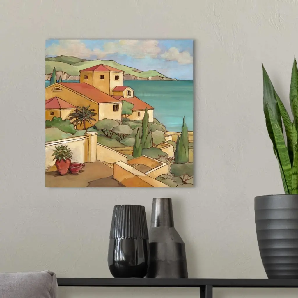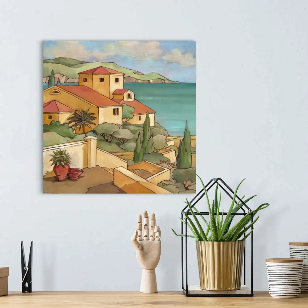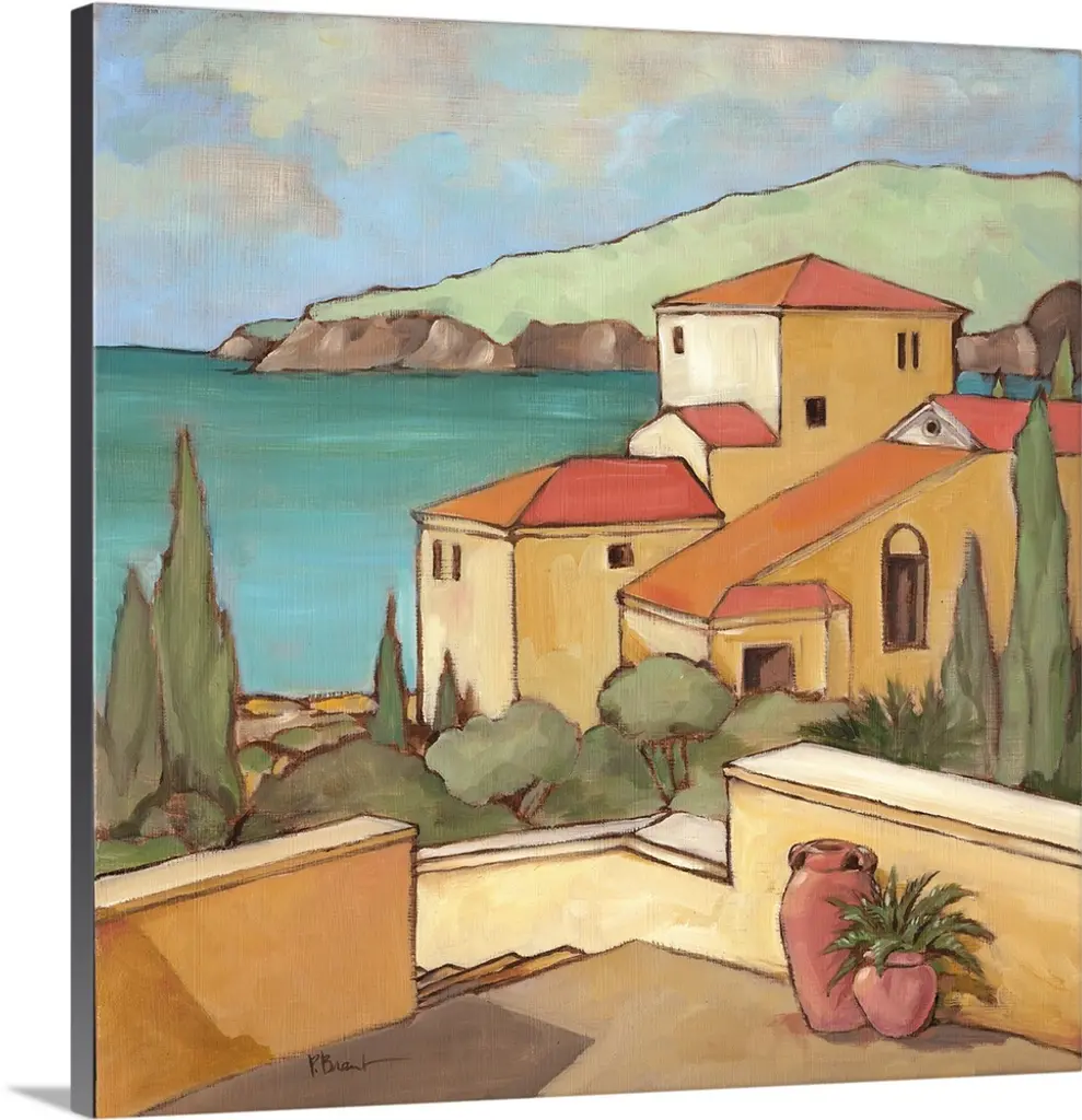 Painting of a Mediterranean town overlooking the sea.