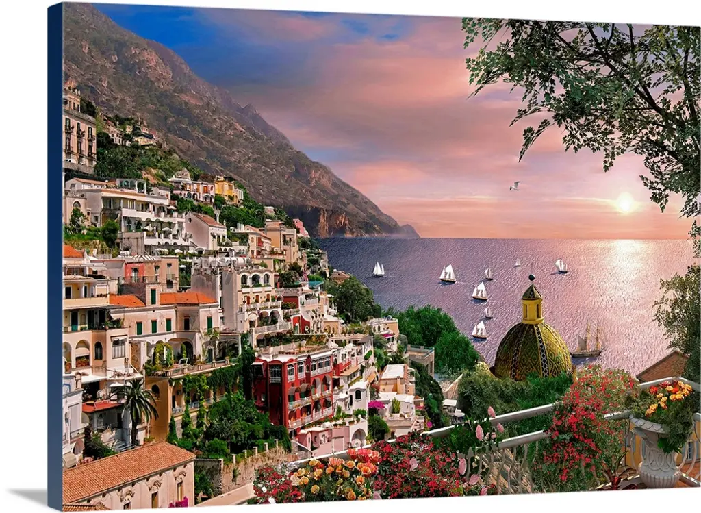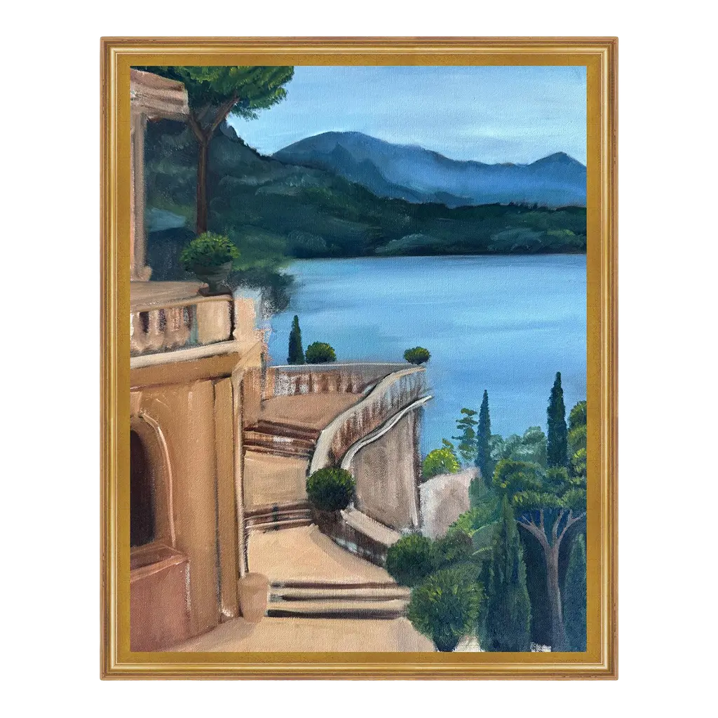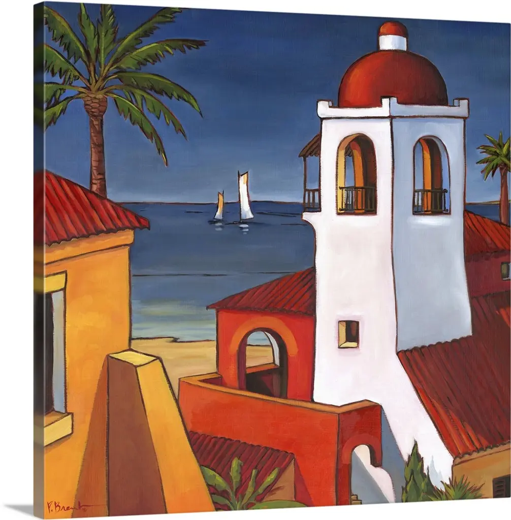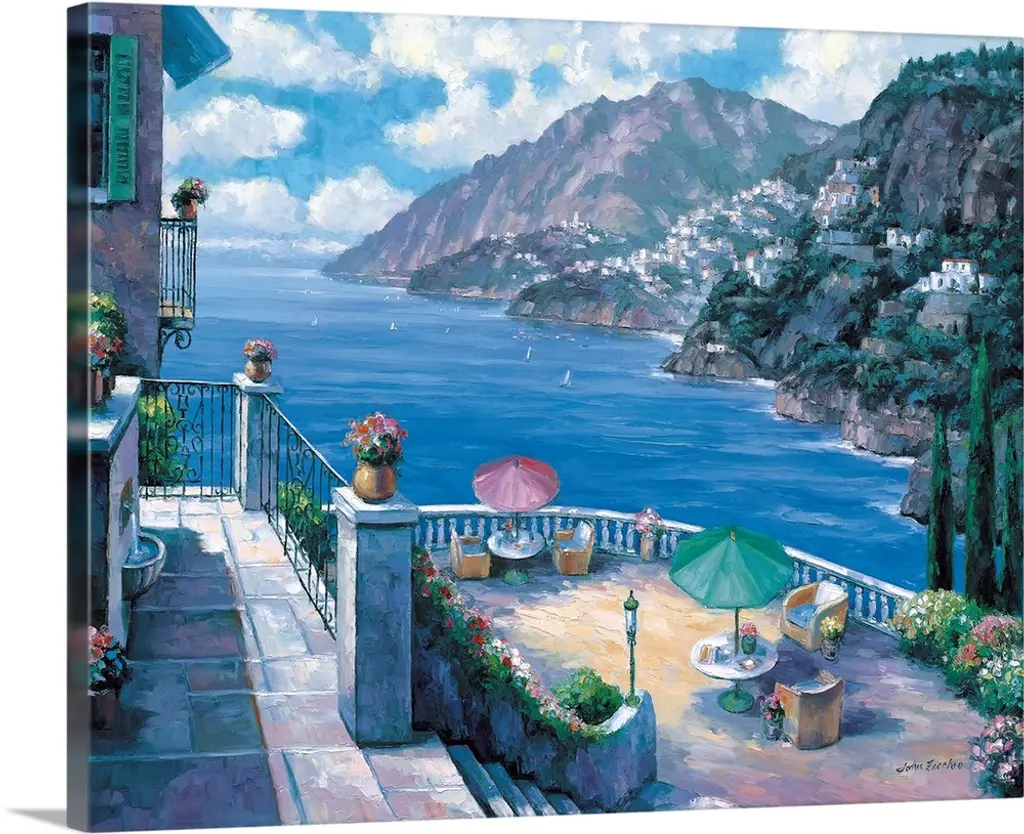 Painting of a Mediterranean town overlooking the sea.