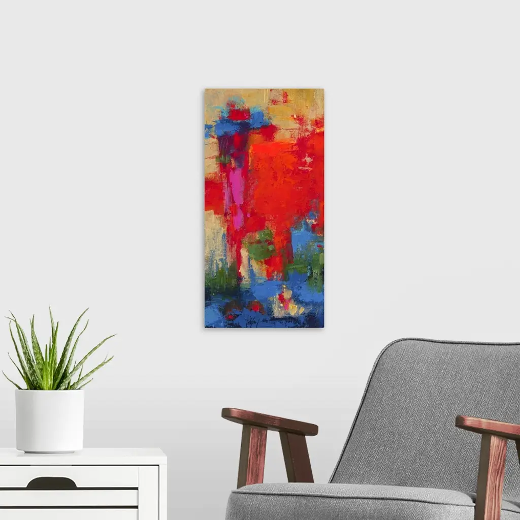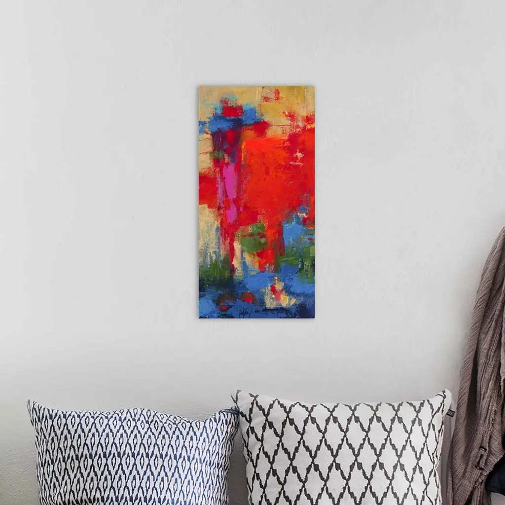 Vertical abstract painting in tropical, almost neon shades of red, green, and blue.