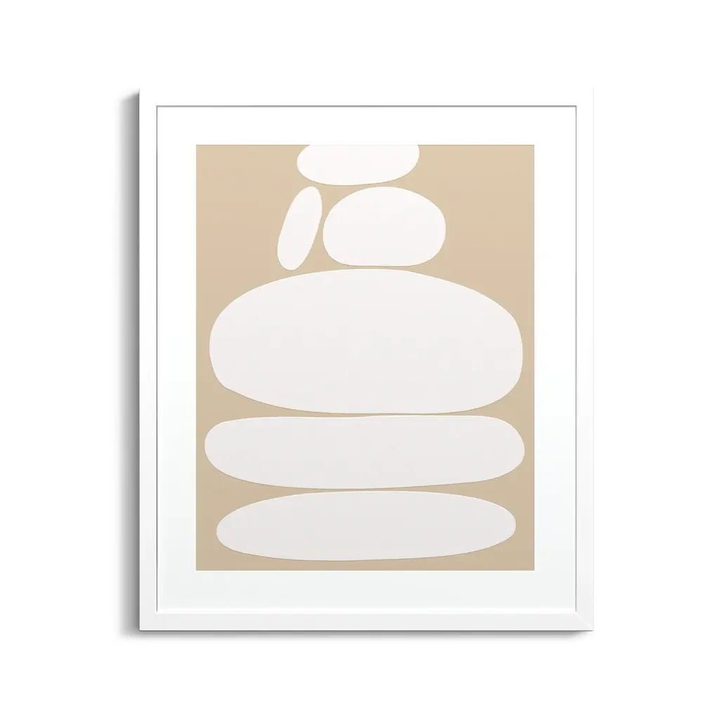 A trio of stones in balance are featured in this modern wall print from photographer Carley Rudd. It captures a calm, grounding moment, perfect for a bedroom or tranquil living space. This piece inspires a quiet ambiance with organic tones set to elevate your wall decor.