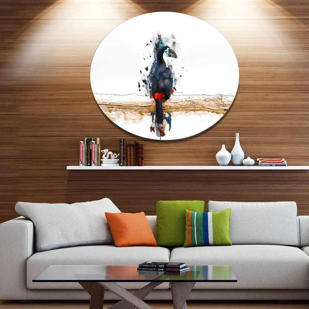 Bring Contemporary Abstraction to your home with this large Circle Metal wall art. This Toucan on the Branch Metal Artwork makes it the focal point of any room or office. - White Gloss Coating ensures colors are extra vibrant with light reflection.- Aluminum grade Sheet Metal with 1 inch mounting frame on the back giving the illusion that the artwork is floating on the wall..- Mounting Brackets are included along with instructions.- High Quality Digital images are created directly into a glossy aluminum panel producing a stunning and captivating print into the glossy finish of the metal.- Water, Fire and Scratch resistant HD Aluminum panels.- Looks better than any photo paper and guaranteed to last at least 20 years- Easy to clean with a microfiber cloth. Colors are far superior to regular Canvas Art. - Easy to Hang