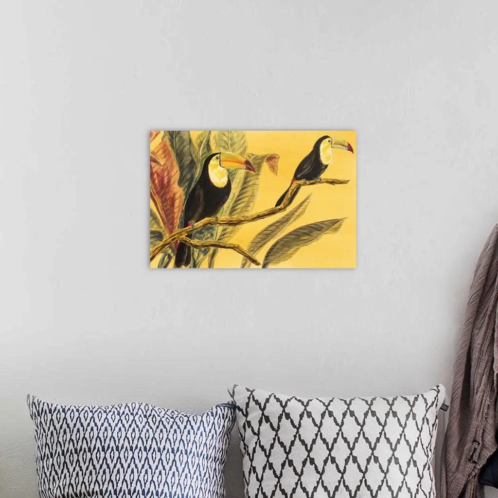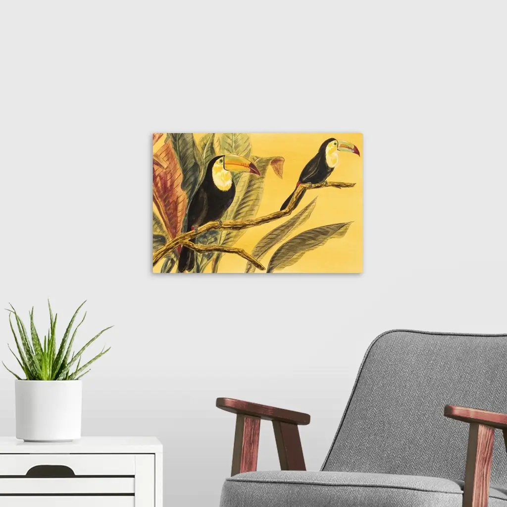Contemporary artwork of toucans perched on a branch.