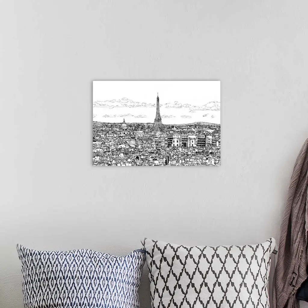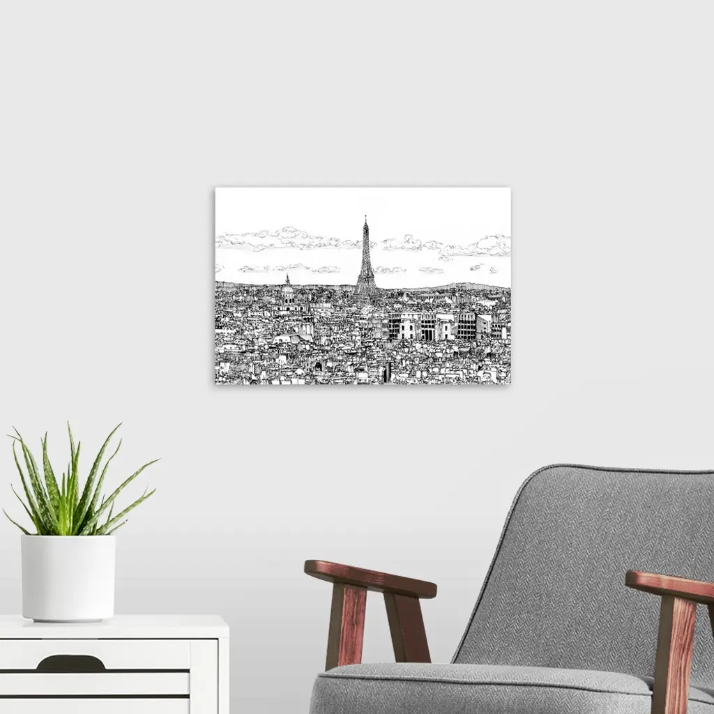 Contemporary black and white sketch of a cityscape in Paris, France with the Eiffel Tower towering over the city.