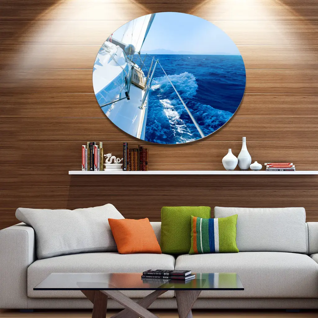 Bring Contemporary Abstraction to your home with this large Circle Metal wall art. This Tourism Yacht Sailing in Blue Sea Metal Artwork makes it the focal point of any room or office. - White Gloss Coating ensures colors are extra vibrant with light reflection.- Aluminum grade Sheet Metal with 1 inch mounting frame on the back giving the illusion that the artwork is floating on the wall..- Mounting Brackets are included along with instructions.- High Quality Digital images are created directly into a glossy aluminum panel producing a stunning and captivating print into the glossy finish of the metal.- Water, Fire and Scratch resistant HD Aluminum panels.- Looks better than any photo paper and guaranteed to last at least 20 years- Easy to clean with a microfiber cloth. Colors are far superior to regular Canvas Art. - Easy to Hang