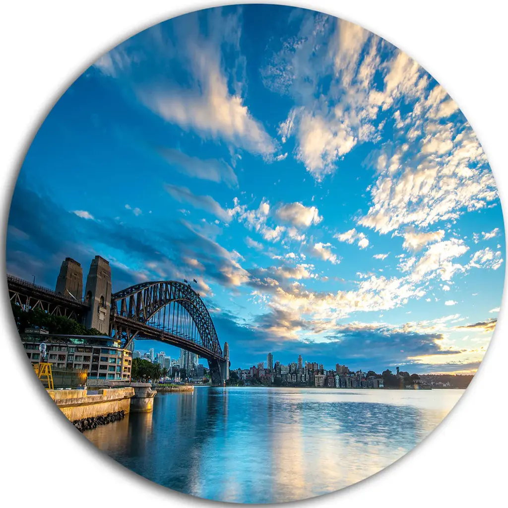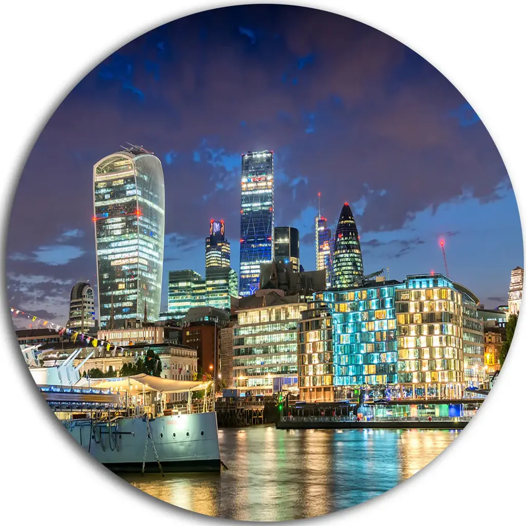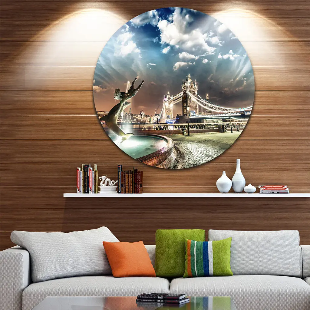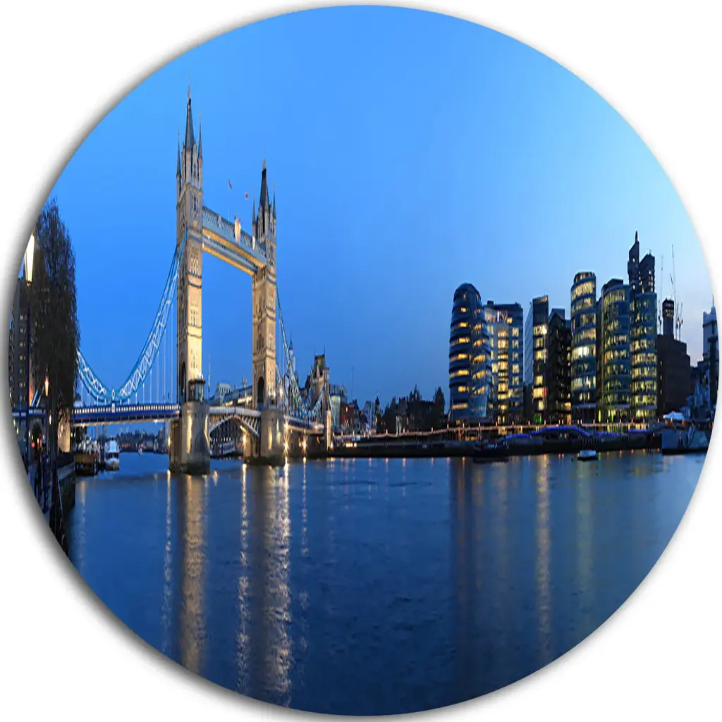 Bring Contemporary Abstraction to your home with this large Circle Metal wall art. This Tower Bridge at Night Metal Artwork makes it the focal point of any room or office. - White Gloss Coating ensures colors are extra vibrant with light reflection.- Aluminum grade Sheet Metal with 1 inch mounting frame on the back giving the illusion that the artwork is floating on the wall..- Mounting Brackets are included along with instructions.- High Quality Digital images are created directly into a glossy aluminum panel producing a stunning and captivating print into the glossy finish of the metal.- Water, Fire and Scratch resistant HD Aluminum panels.- Looks better than any photo paper and guaranteed to last at least 20 years- Easy to clean with a microfiber cloth. Colors are far superior to regular Canvas Art. - Easy to Hang