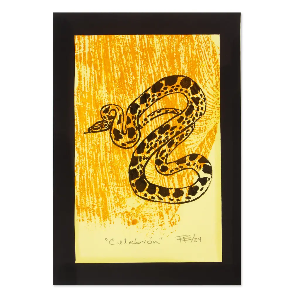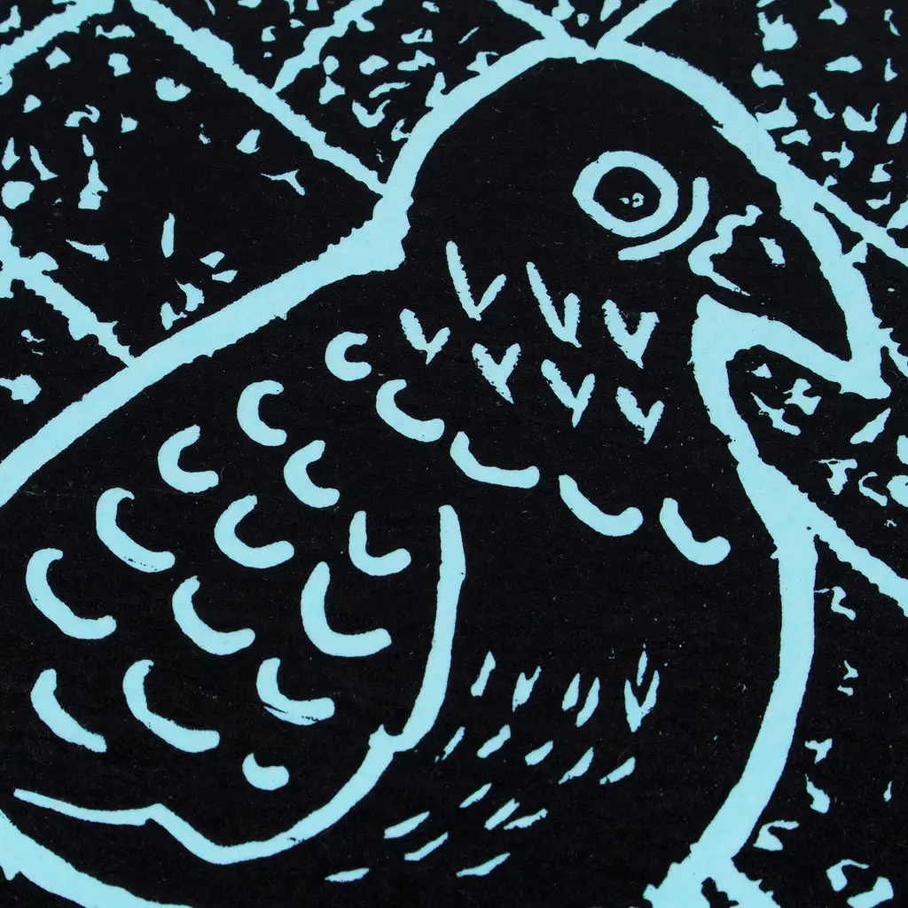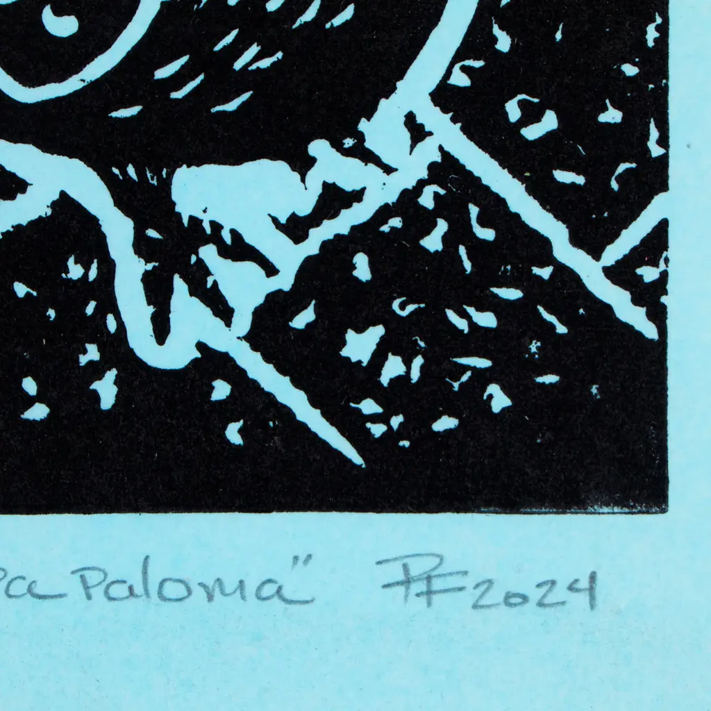 "Such big eyes for a pigeon," say people in the Mexican region whenever they suspect someone is not telling the whole truth. But some lies have a particular meaning underneath, just as R. Fabricio's newest wood block print intends to convey through intense hues. After all, Fabricio's ink composition already portrays the pigeon, this time through a blue veil of loyalty.The piece is titled Muy ojona pa paloma in Spanish.