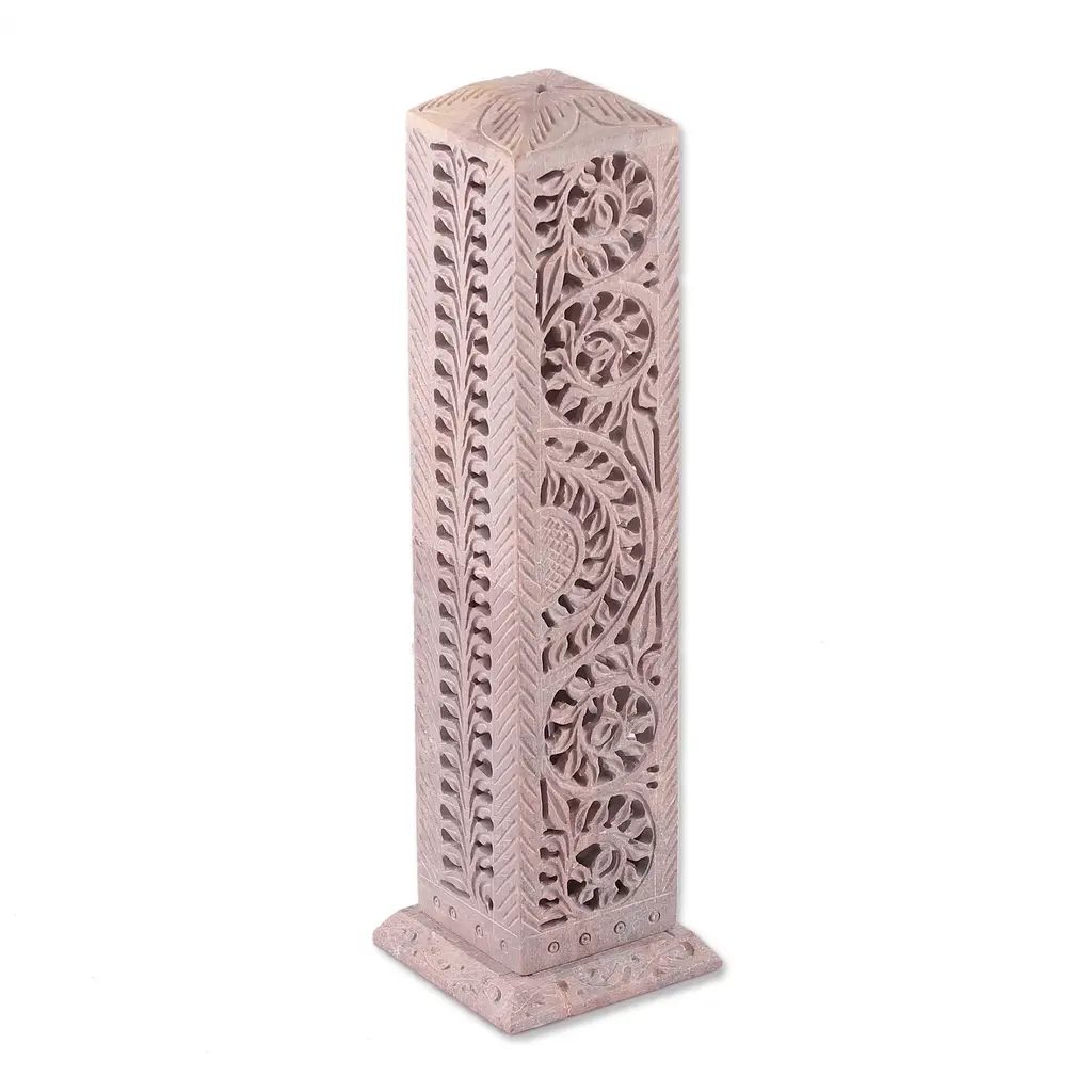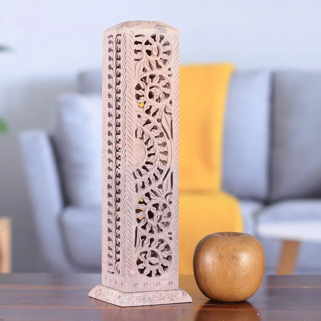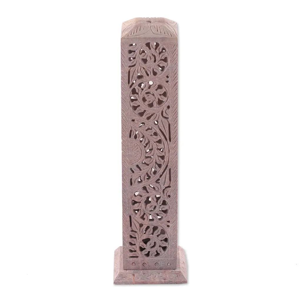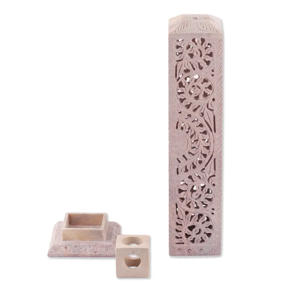 Hand-carved following the traditional jali techniques, Gulam Rasool's incense holder profits from the soapstone's natural color to create a wondrous illusion of leafy details. Composed of three pieces, the design allows you to easily place an incense stick inside and showcase a unique artwork—infused with India's serene aura.