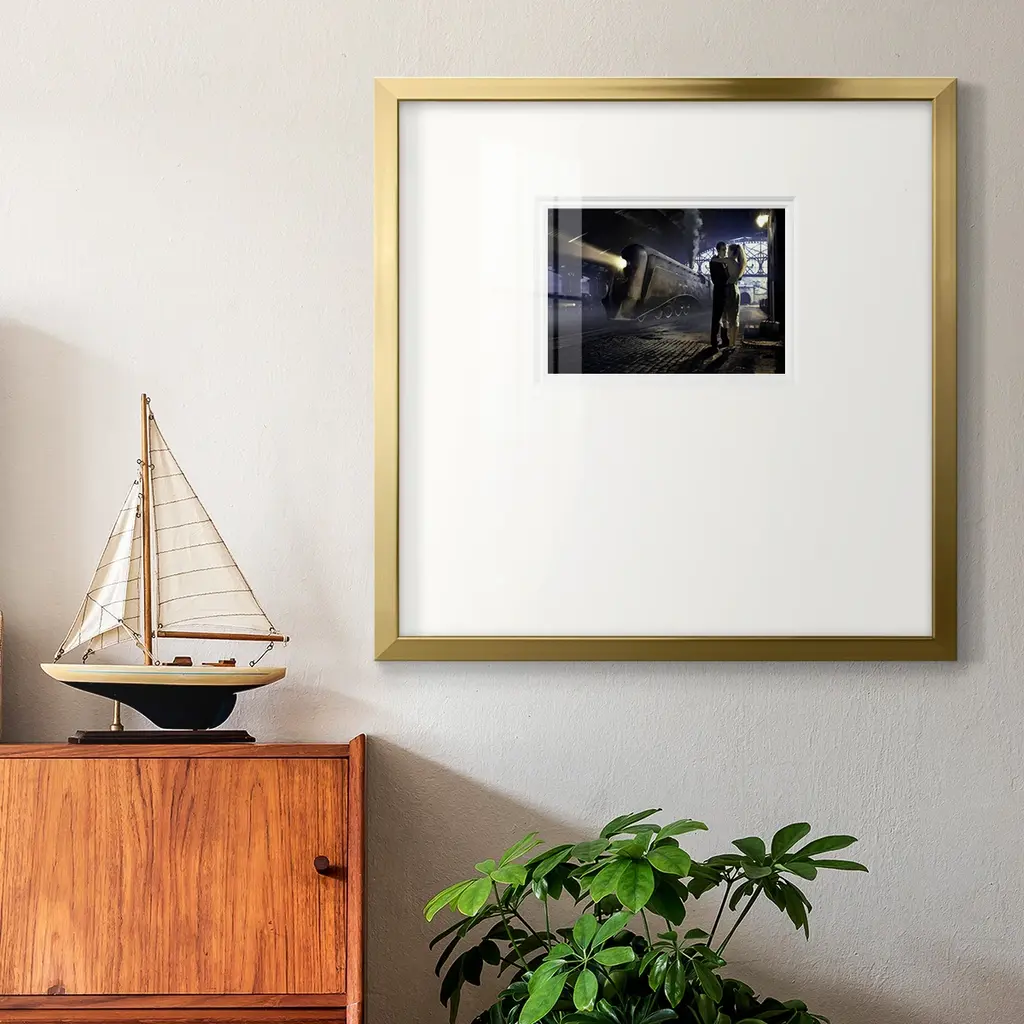 Train DepotPremium Framed Print A framed cold pressed paper print featuring superior double matting and quality frame. 2 SIZES AVAILABLE 16''X16''' - Overall Size 20''X20''' - Overall Size Each piece is made to order. Each piece comes with hanging hardware. Made in the USA Ready to Hang Giclee Paper Print Plexiglass Beveled Matt Board Double Matte Board