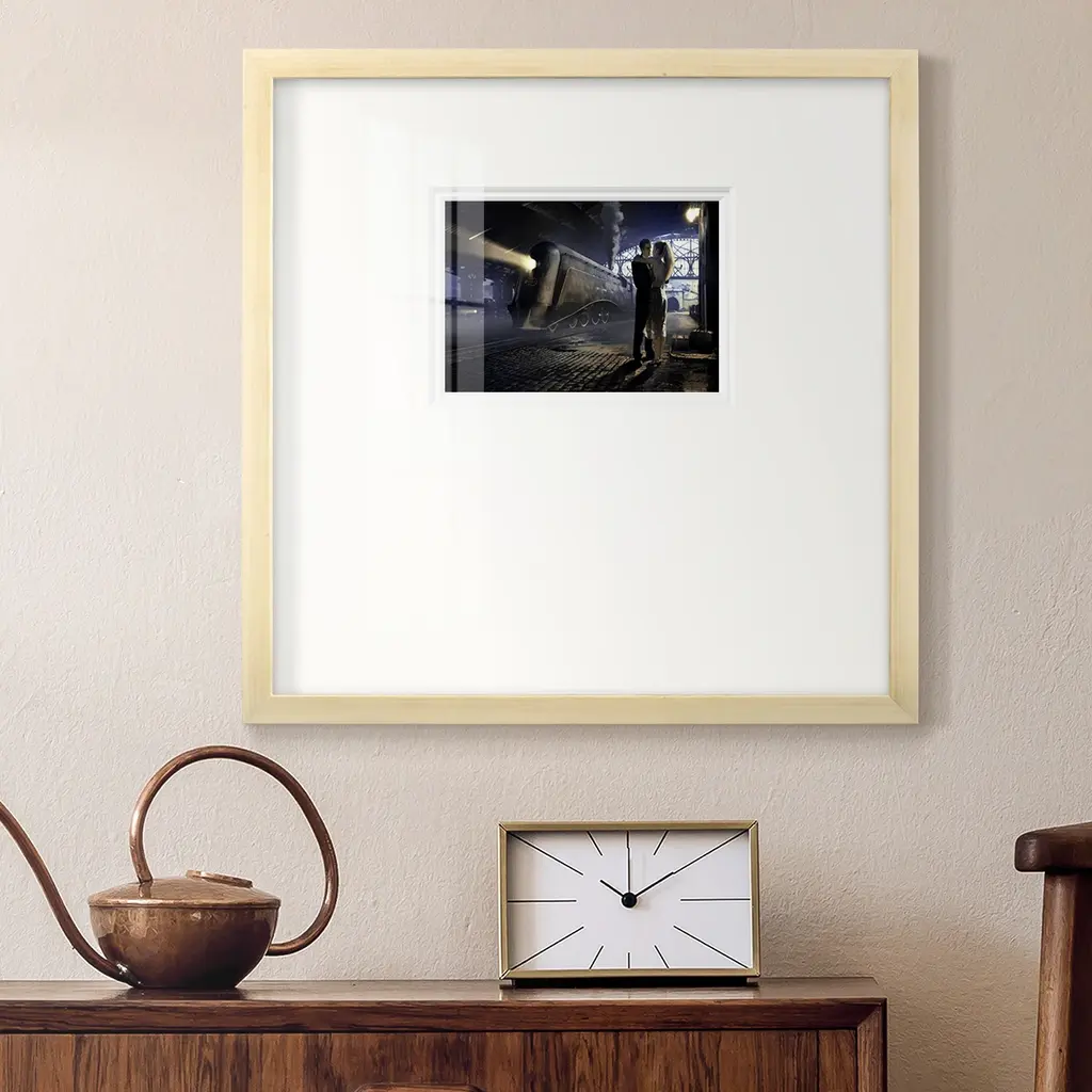 Train DepotPremium Framed Print A framed cold pressed paper print featuring superior double matting and quality frame. 2 SIZES AVAILABLE 16''X16''' - Overall Size 20''X20''' - Overall Size Each piece is made to order. Each piece comes with hanging hardware. Made in the USA Ready to Hang Giclee Paper Print Plexiglass Beveled Matt Board Double Matte Board