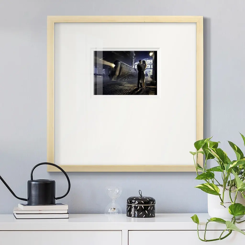 Train DepotPremium Framed Print A framed cold pressed paper print featuring superior double matting and quality frame. 2 SIZES AVAILABLE 16''X16''' - Overall Size 20''X20''' - Overall Size Each piece is made to order. Each piece comes with hanging hardware. Made in the USA Ready to Hang Giclee Paper Print Plexiglass Beveled Matt Board Double Matte Board