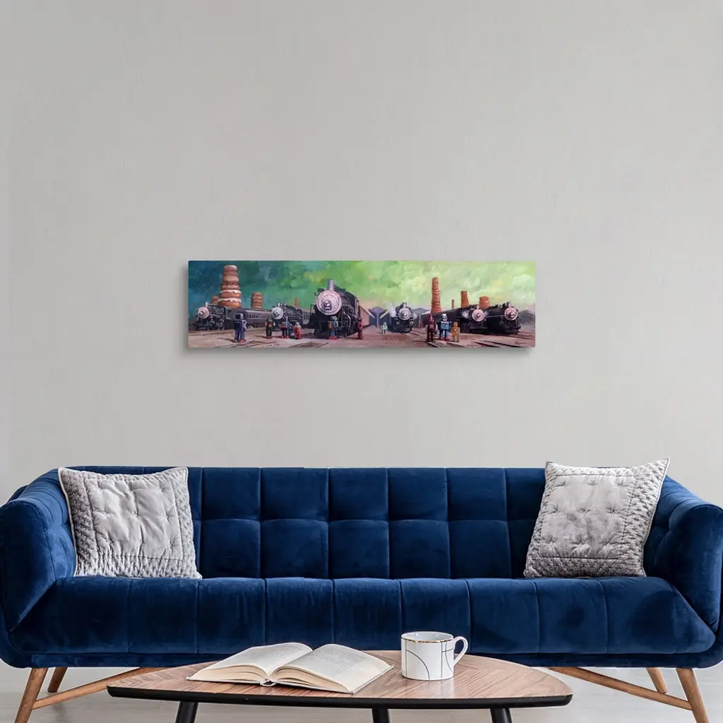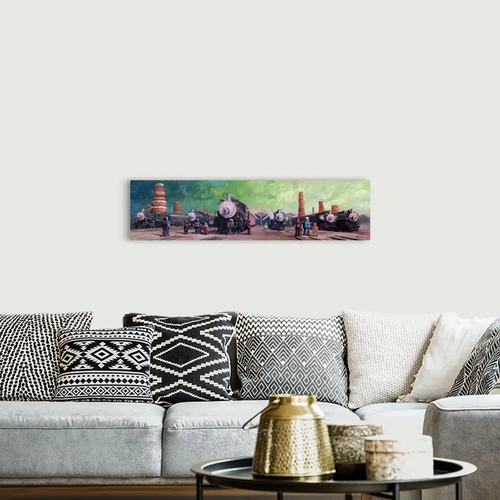 A contemporary painting of different colored retro toy robots standing in a train yard with giant steam engine trains all around and giant towers of frosted donuts seen in the background.