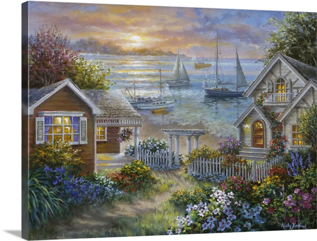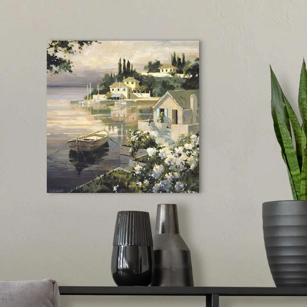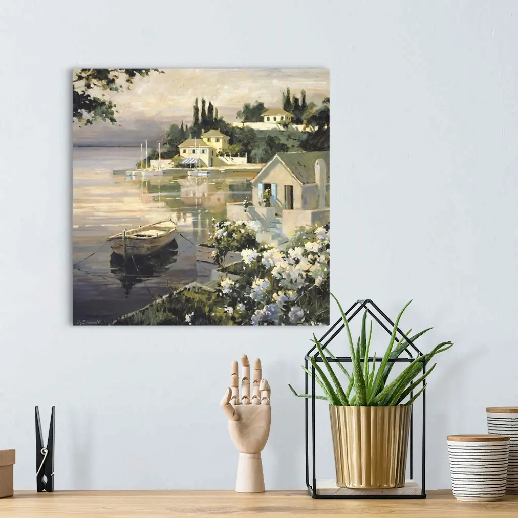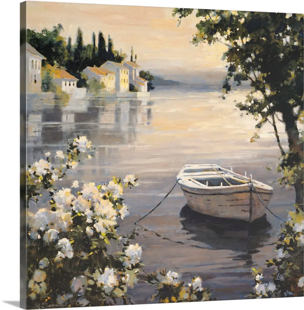 Contemporary painting of a small village harbor, with a white rowboat anchored near the shore.
