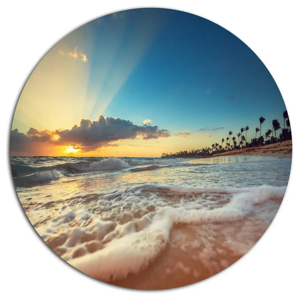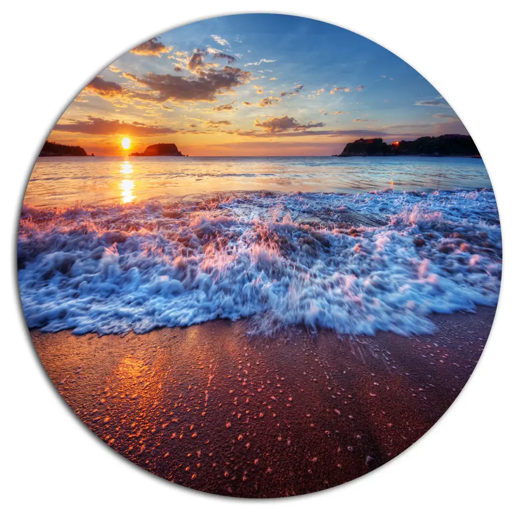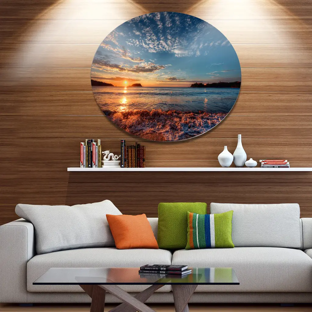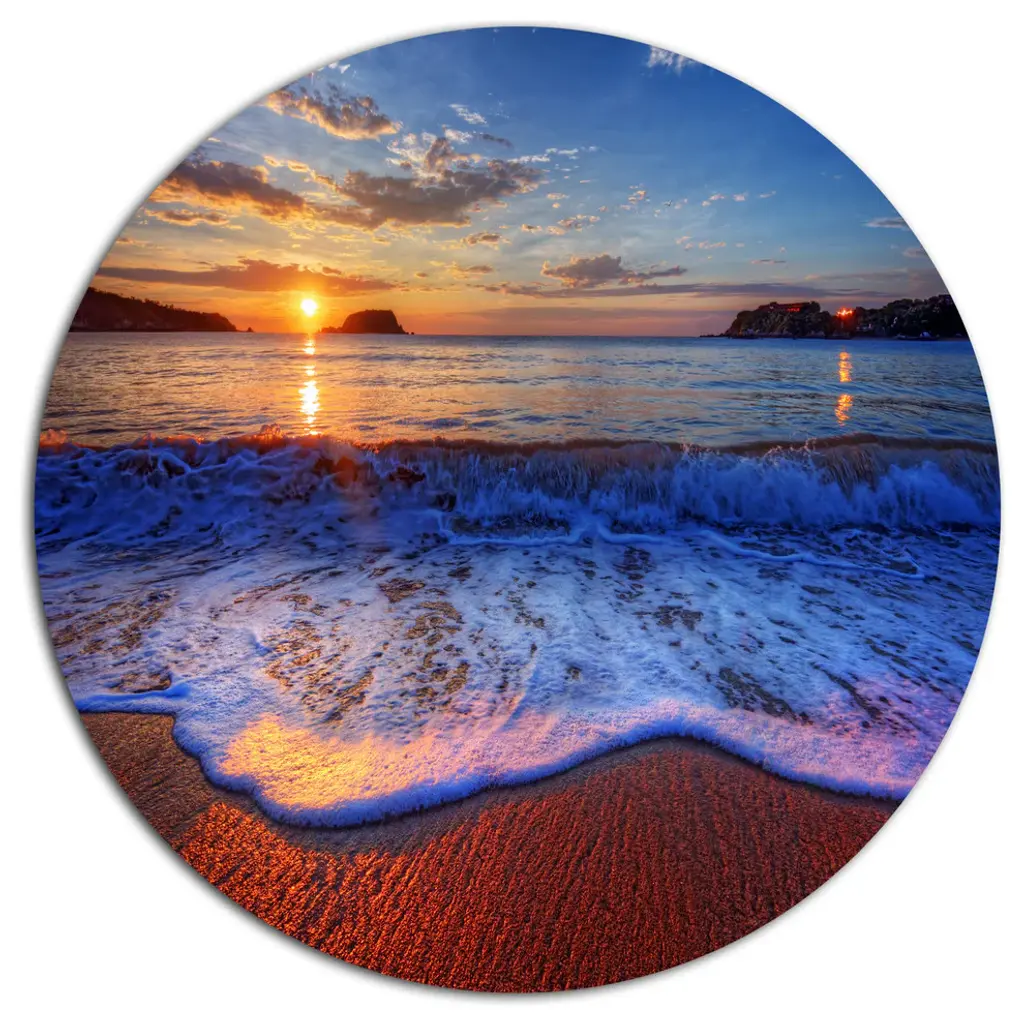 Bring Contemporary Abstraction to your home with this large Circle Metal wall art. This Tranquil Beach and Whimsical Clouds Metal Artwork makes it the focal point of any room or office. - White Gloss Coating ensures colors are extra vibrant with light reflection.- Aluminum grade Sheet Metal with 1 inch mounting frame on the back giving the illusion that the artwork is floating on the wall..- Mounting Brackets are included along with instructions.- High Quality Digital images are created directly into a glossy aluminum panel producing a stunning and captivating print into the glossy finish of the metal.- Water, Fire and Scratch resistant HD Aluminum panels.- Looks better than any photo paper and guaranteed to last at least 20 years- Easy to clean with a microfiber cloth. Colors are far superior to regular Canvas Art. - Easy to Hang