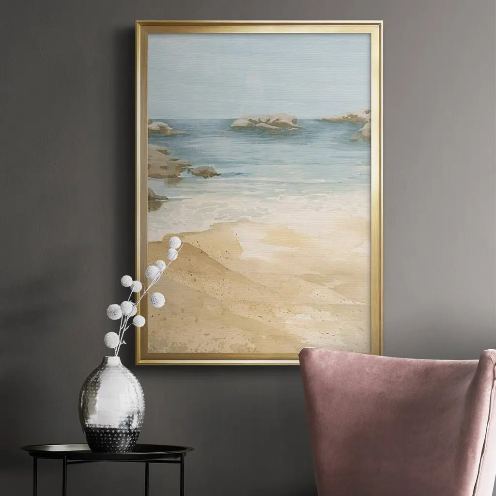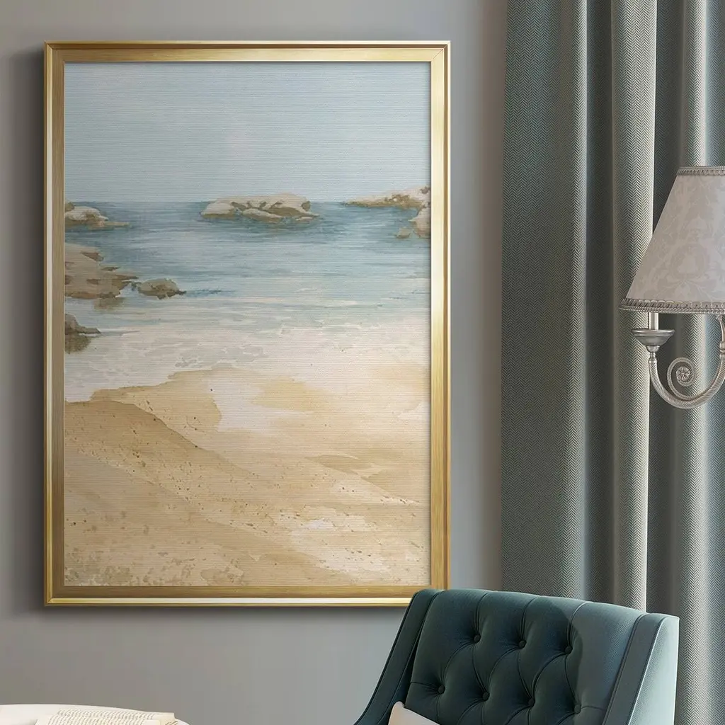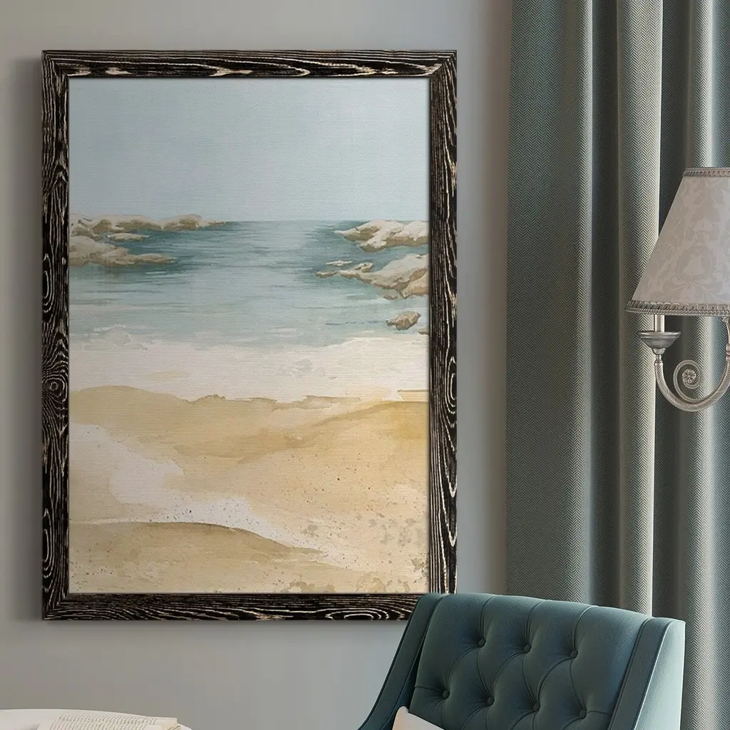 Tranquil Beach I Premium Framed Print - Ready to Hang A Premium Framed Print created to last. Framed in distressed wood and available in an array of sizes and colors Featuring a beveled a solid wood stretcher bar, each piece comes ready to hand 4 SIZES AVAILABLE 30.5''X42.5'' - Overall Size 26.5'X36.5'' - Overall Size 22.5''x30.5'' - Overall Size 18.5''x24.5'' - Overall Size Each piece is made to order. Each piece comes with hanging hardware. Made in the USA Ready to Hang