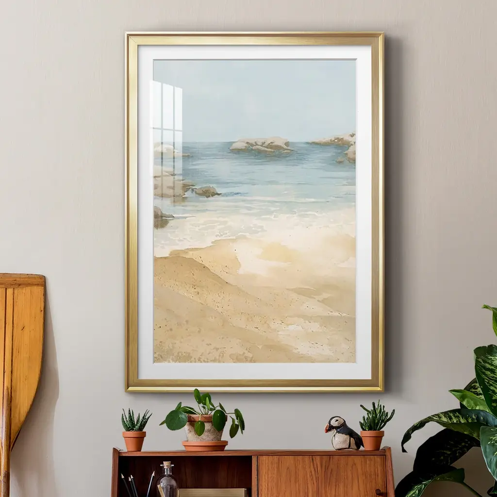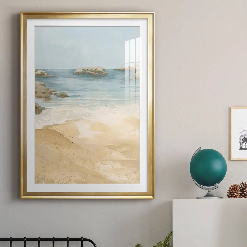 Tranquil Beach I Premium Framed Print - Ready to Hang A Premium Framed Print created to last. Framed in distressed wood and available in an array of sizes and colors Featuring a beveled a solid wood stretcher bar, each piece comes ready to hand 4 SIZES AVAILABLE 30.5''X42.5'' - Overall Size 26.5'X36.5'' - Overall Size 22.5''x30.5'' - Overall Size 18.5''x24.5'' - Overall Size Each piece is made to order. Each piece comes with hanging hardware. Made in the USA Ready to Hang Giclee Paper Print Acrylic Glass Beveled Matt Board